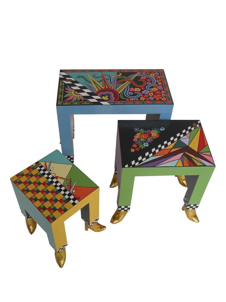 Set di 3 tavolini Tom's DragChi pone un forte accento cromatico con un oggetto o un mobile "Tom's Drags" fa naturalmente una dichiarazione di stile sicura. Oltre a specchi e ciotole nel tipico stile "Tom's Drags", la collezione "Tom's Drags" comprende anche una sedia con ali e cassettiere di varie dimensioni. Ogni pezzo è più folle ed eccentrico dell'altro, ma tutti sono dei veri e propri richiami per gli occhi e dei punti di forza in ogni casa.Dimensioni dei singoli tavoli (L x P x A)S = 26 x 30 x 37 cm M = 41 x 30 x 44 cmL = 56 x 30 x 51 cm