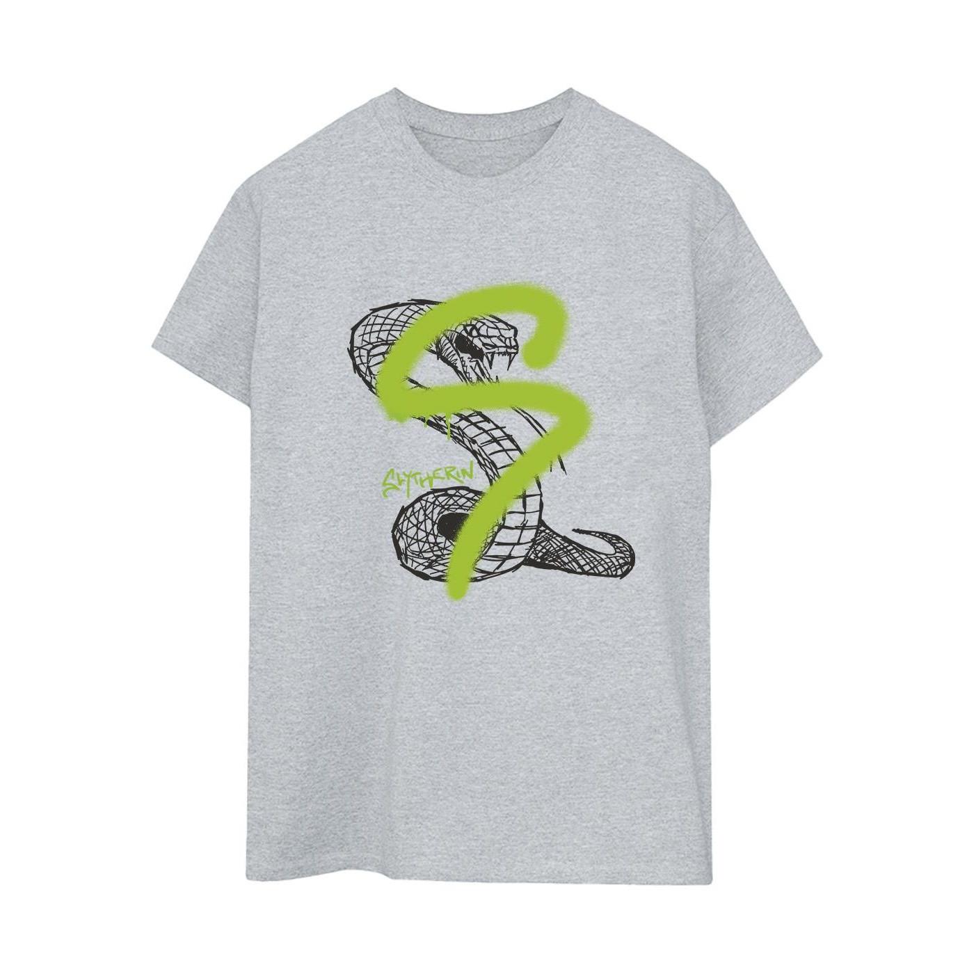 Questa T-shirt presenta una sorprendente stampa grafica ispirata alla casa Serpeverde. Il design include un'illustrazione dettagliata di un serpente con una vivace sovrapposizione di una «S» verde, catturando l'estetica distintiva di Serpeverde. È realizzata al 100% in cotone ring-spun, offrendo una sensazione super morbida e una vestibilità rilassata da boyfriend.