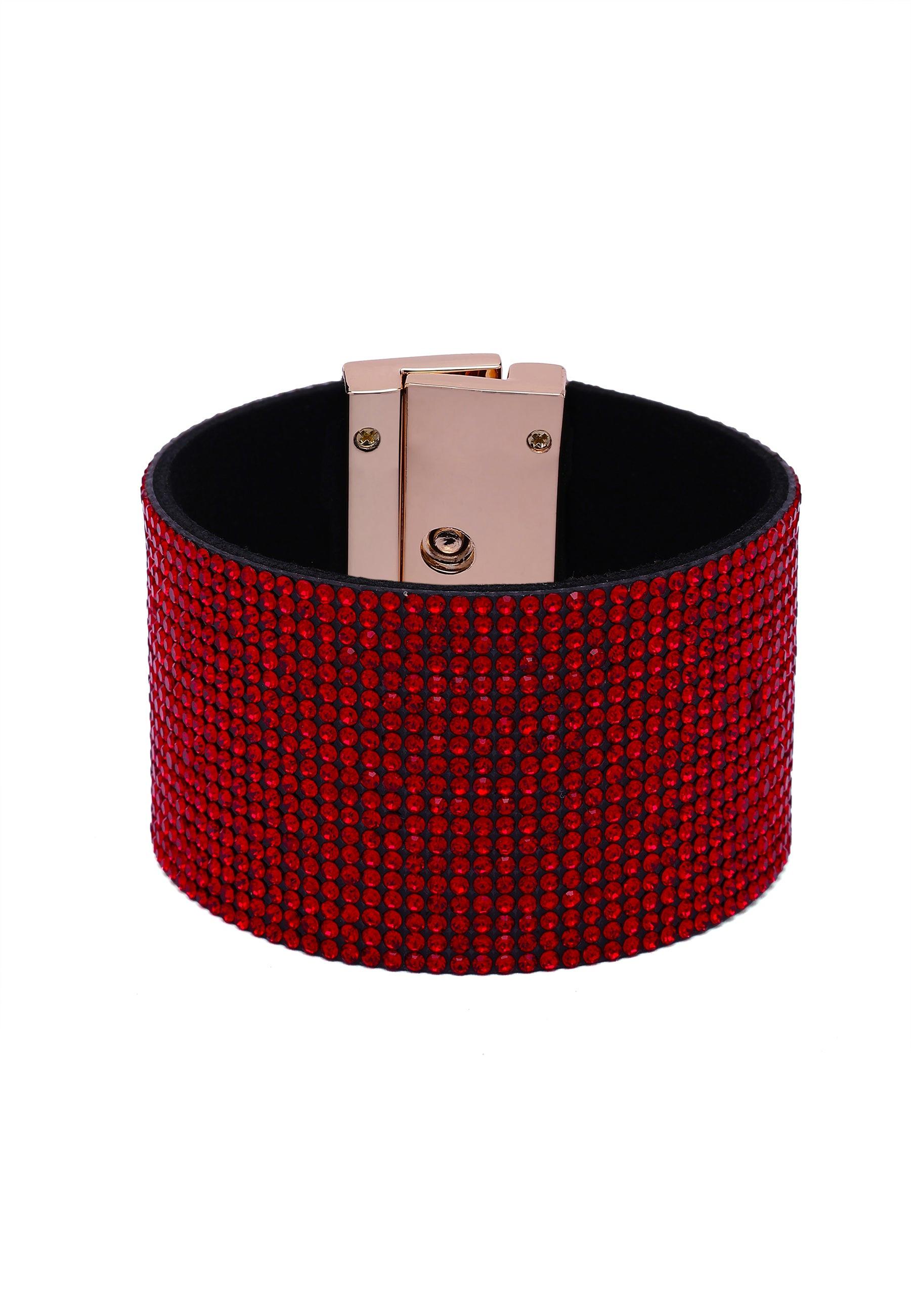 Avvolgi il tuo polso con pura energia da diva. Questo ampio bracciale in pelle è ricoperto di cristalli scarlatti, creando un luccichio rosso fuso che ricorda quello di un red carpet. Foderato in morbida pelle scamosciata e rifinito con un'elegante chiusura lucida, è un pezzo audace e lussuoso per le serate in cui vuoi che tutti gli occhi siano puntati su di te. Dimensioni: Diametro 6,5 cm, Lunghezza 20 cm, Larghezza 4 cm | Placcatura: Placcato oro | Chiusura: Fibbia magnetica