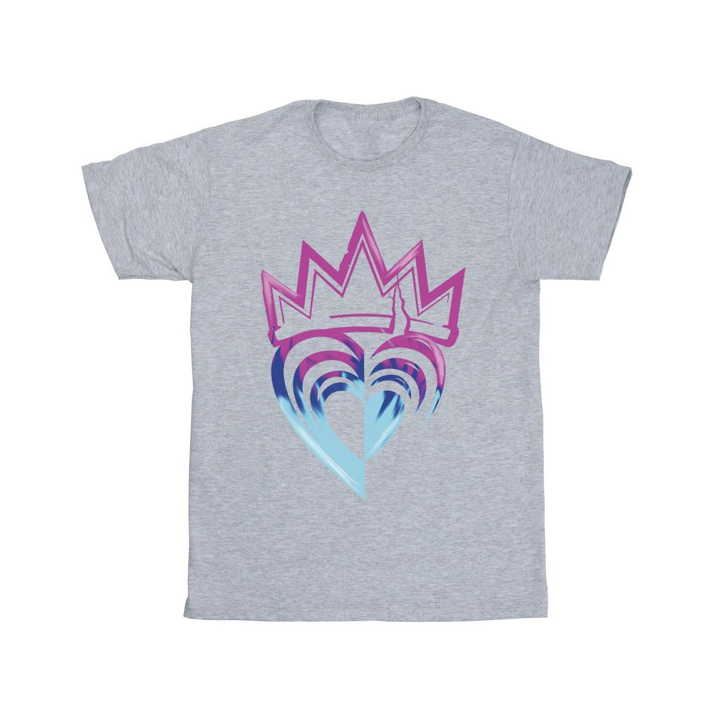 Questa T-shirt con una vivace stampa grafica ispirata a Descendants è un'aggiunta elegante a qualsiasi guardaroba casual. Il design presenta una corona su un cuore, diviso con colori contrastanti, aggiungendo un elemento visivo unico.