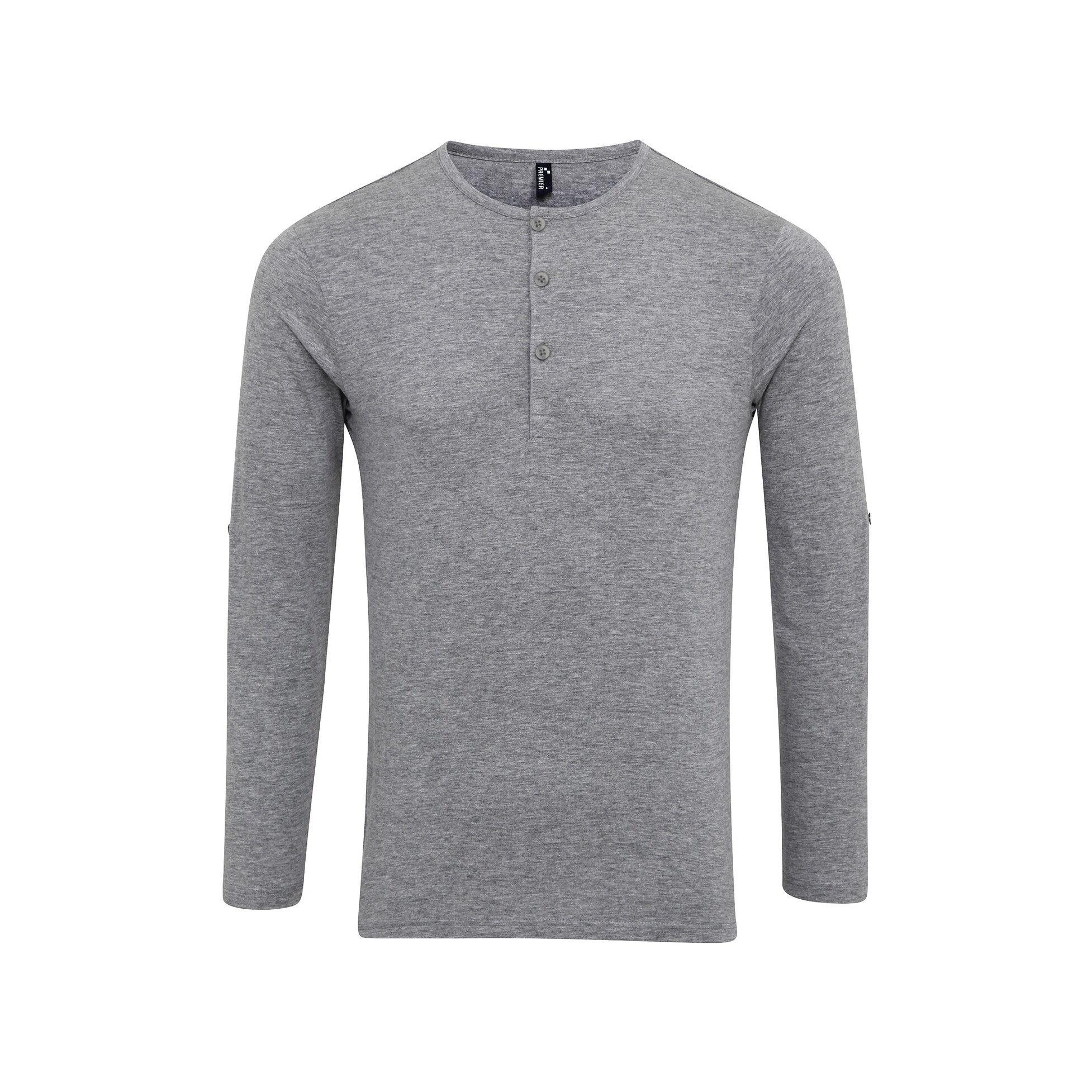 Questa t-shirt a maniche lunghe presenta un classico girocollo e una patta con bottoni per un look versatile. Le maniche possono essere arrotolate e fissate con un bottone interno. Doppie cuciture sono presenti sull'orlo e sui polsini.