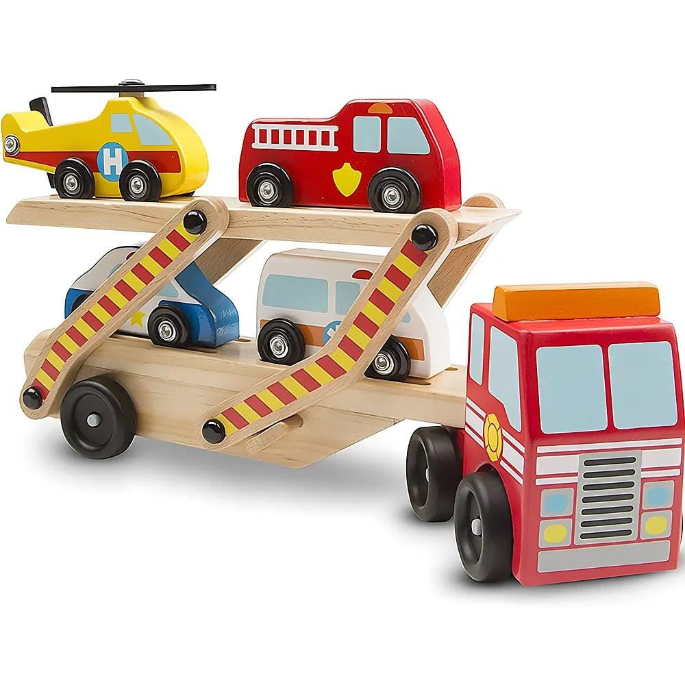 Dieser riesige zweistufige Sattelzug bietet vier Holzrettungsfahrzeuge für unbegrenzte Spielmöglichkeiten. Mit einem Hubschrauber, einem Feuerwehrwagen, einem Polizeiauto und einem Krankenwagen können Kinder auf fantasievolle Notfälle reagieren. Das Oberdeck lässt sich absenken und ermöglicht den spielerischen Transport der Fahrzeuge.