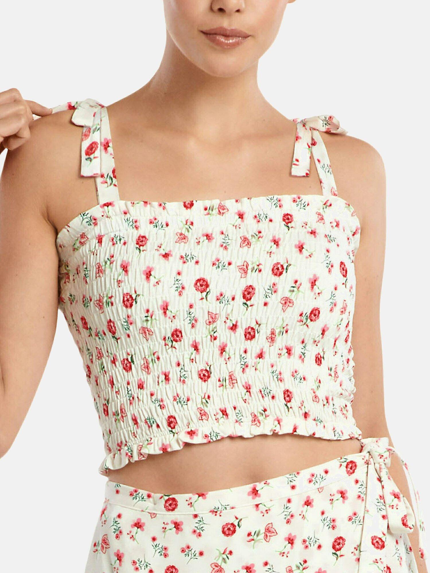 Questo crop top smock della collezione Java presenta un affascinante motivo floreale, rendendolo un capo versatile per varie occasioni. Il comodo top smock può essere perfettamente abbinato a una gonna o ad altri capi. La cucitura elastica su tutta la lunghezza assicura una buona vestibilità e conferisce alla maglia un look retrò. Le spalline sono annodate sulle spalle, creando un bel dettaglio moderno. Il design è dominato dalla nostalgia e dagli stili retrò degli anni '70, con balze e pieghe lussuose. La piacevole maglia in viscosa è stampata con un motivo di piccoli fiori su un materiale di base color sabbia e blu.