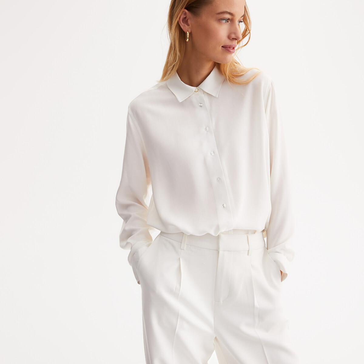Questa camicetta fluida è un ottimo capo base per outfit femminili. Il classico intramontabile ha un taglio dritto e il colletto della camicia può essere indossato aperto o chiuso.