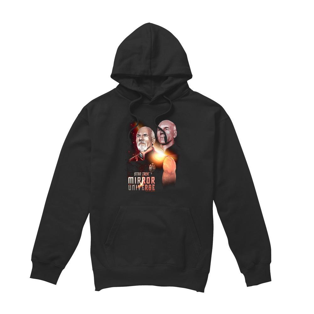 Questa felpa con cappuccio presenta una stampa grafica accattivante ispirata all'"universo specchio di Star Trek". Il design mostra due personaggi di spicco, aggiungendo un elemento unico e riconoscibile al capo. È un capo comodo e versatile, adatto a diverse occasioni casual.