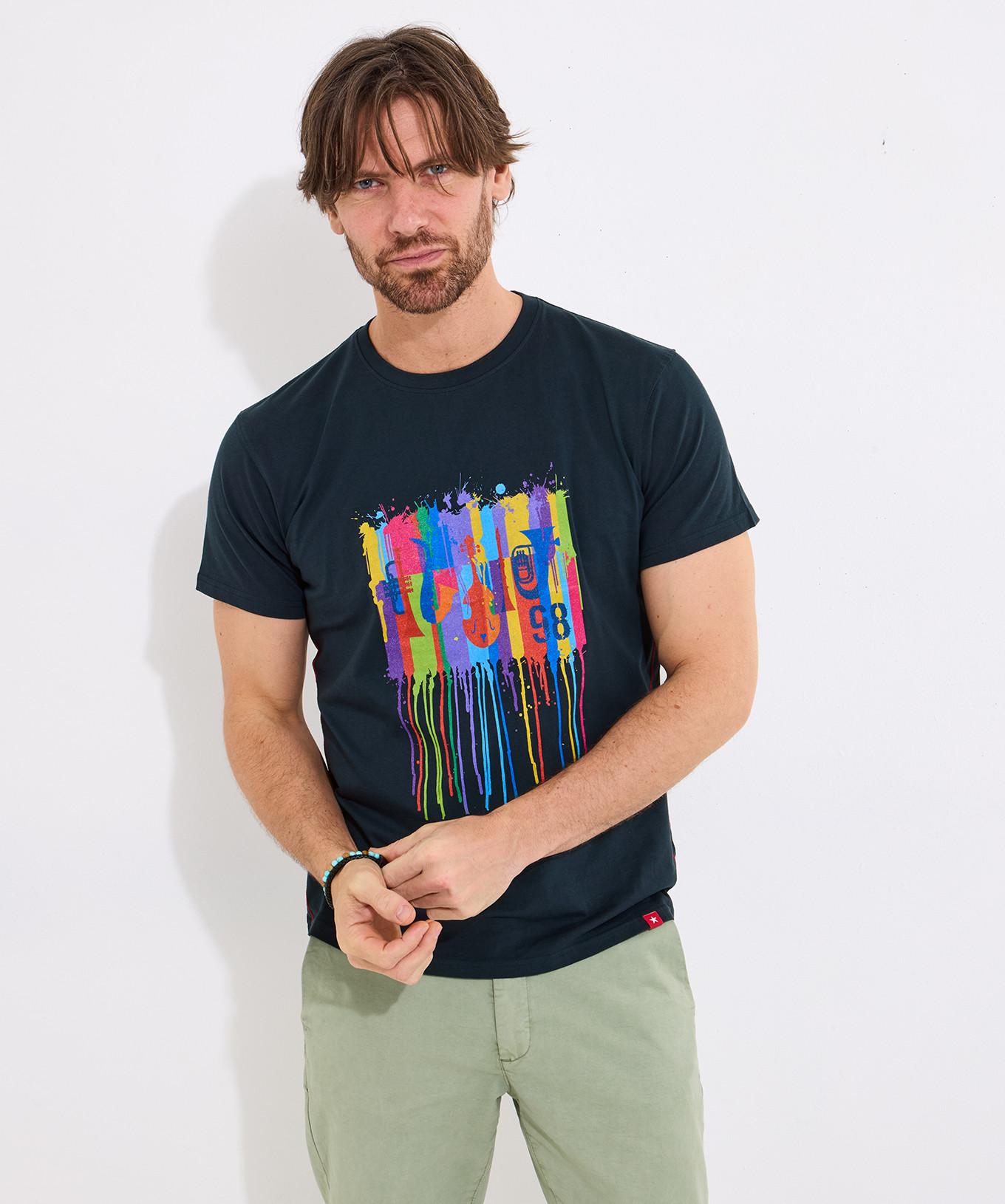 Questa T-shirt presenta una vivace stampa grafica jazz gocciolante sul davanti, aggiungendo un tocco giocoso e artistico a una silhouette classica. Il design a maniche corte e lo scollo rotondo assicurano comfort e versatilità per l'uso quotidiano.