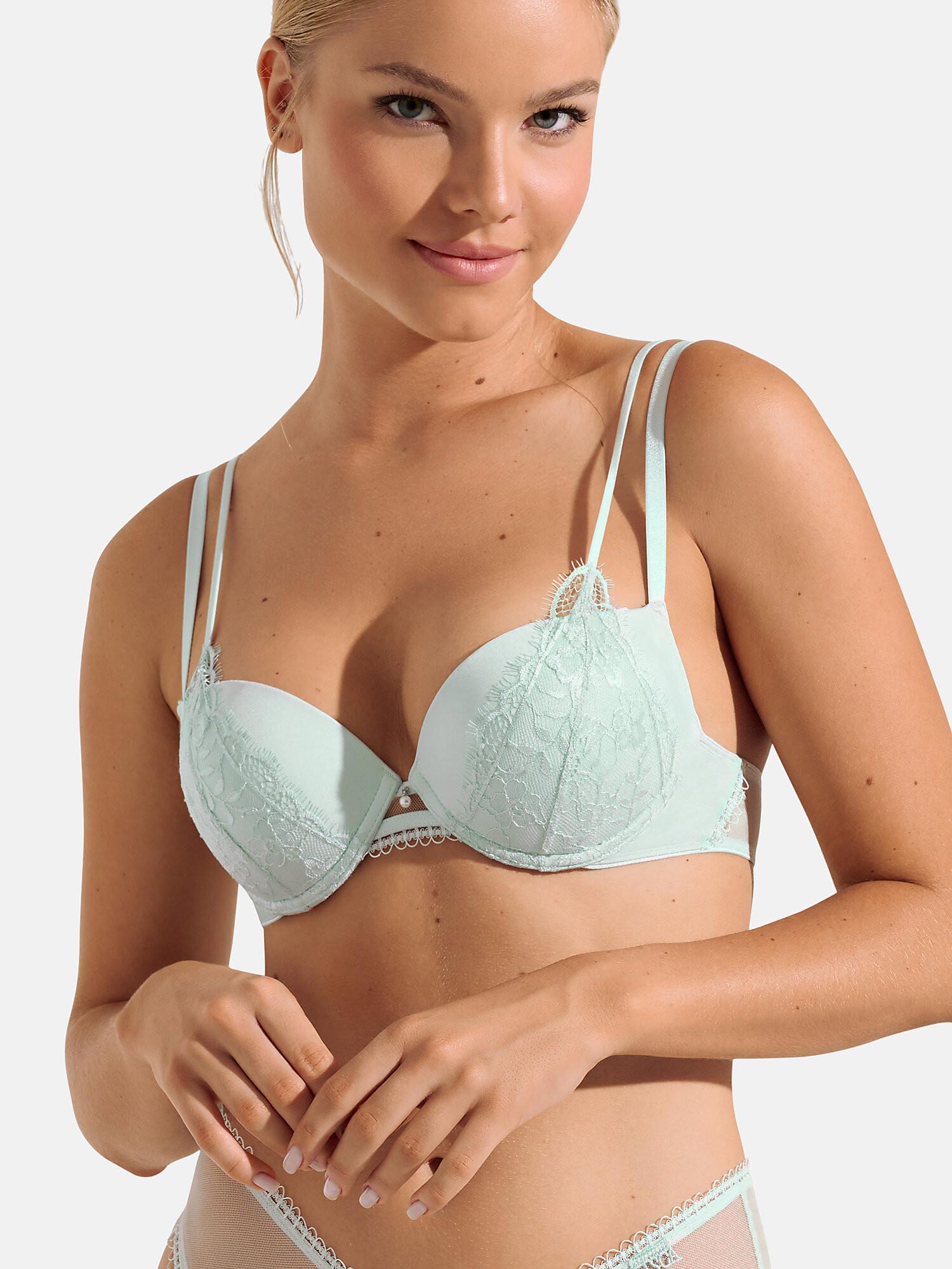 Questo reggiseno push-up della collezione Daydream presenta coppe che esaltano il décolleté. Il pizzo triangolare sulle coppe è prolungato da un sottile piping di 5 mm, che dà l'impressione di coppe in due parti. La schiena trasparente in due parti è funzionale e confortevole, nonostante la sua leggerezza. Le spalline e la fascia di chiusura sono regolabili per una vestibilità perfetta e più ampie nelle taglie più grandi.