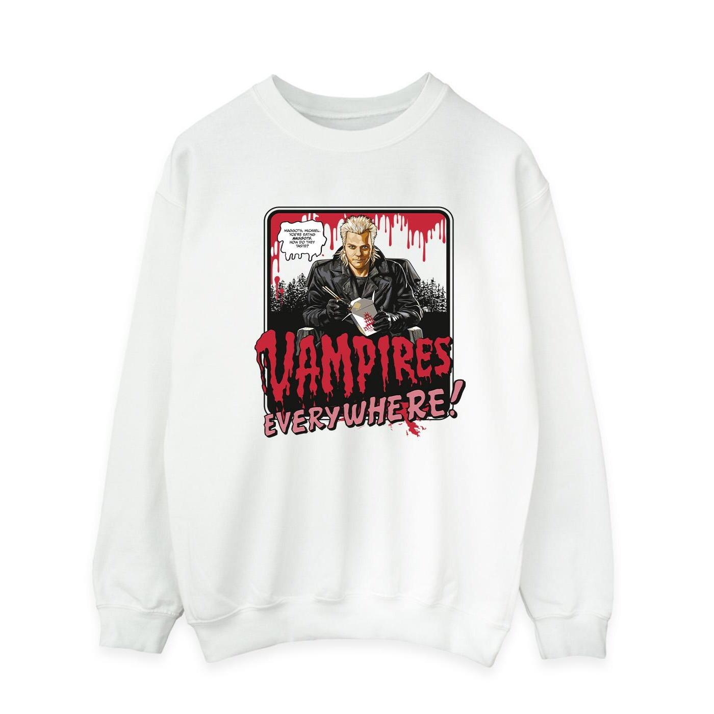 Questa felpa presenta una stampa grafica sorprendente, che la rende un'aggiunta distintiva a qualsiasi guardaroba. Il design mostra un personaggio con un'estetica da fumetto, su uno sfondo schizzato di sangue, e il testo audace «VAMPIRES EVERYWHERE!».