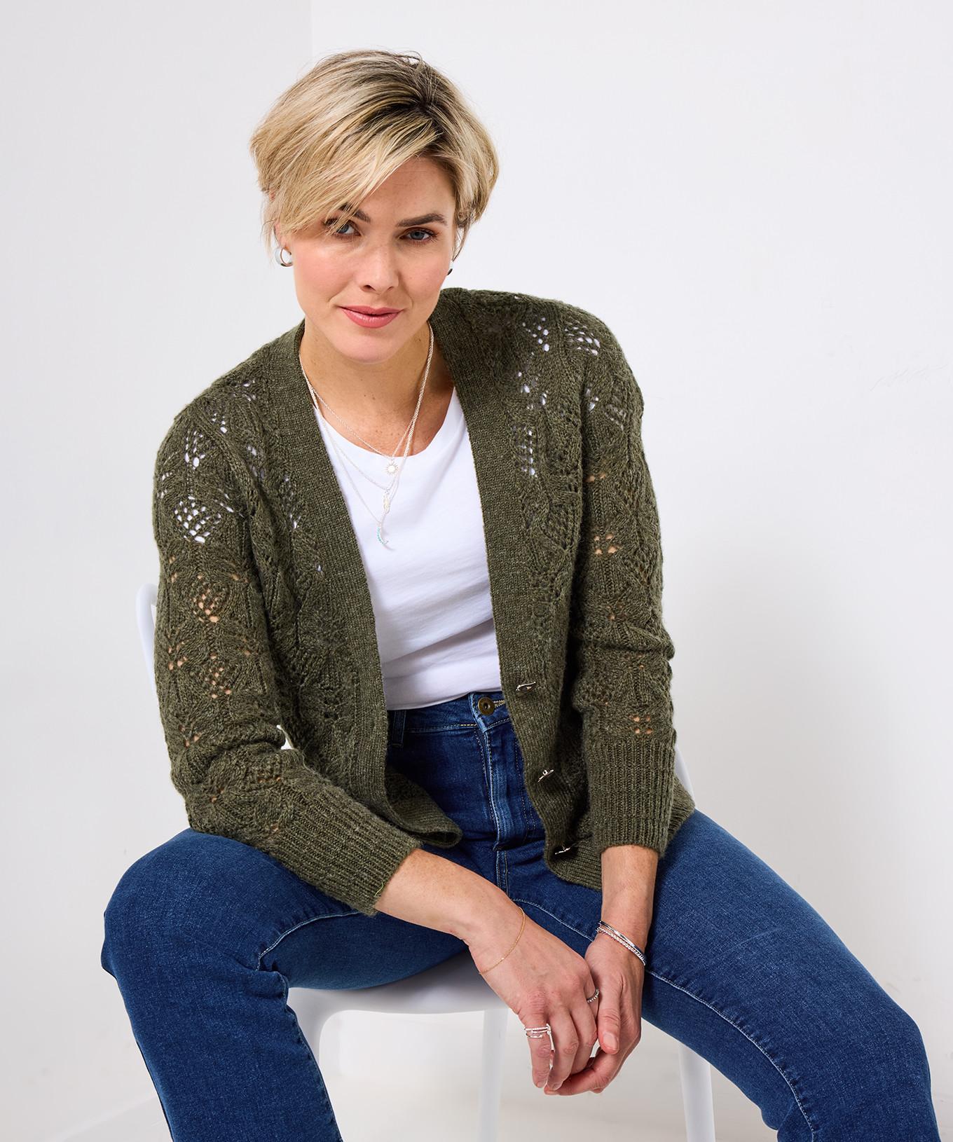Questo cardigan in maglia pointelle è un'aggiunta affascinante e versatile a qualsiasi guardaroba. Il complesso motivo traforato offre una texture delicata, mentre il design classico assicura che possa essere abbinato per varie occasioni.