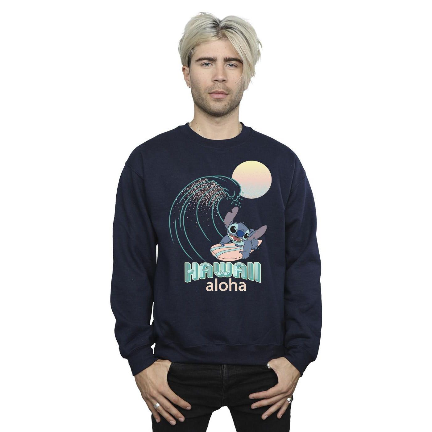 Questa felpa presenta una grafica giocosa di Stitch che cavalca un'onda sotto una luna piena, con la scritta "HAWAII aloha". Il design cattura un'atmosfera divertente e tropicale, rendendola una scelta comoda ed elegante per l'abbigliamento casual.