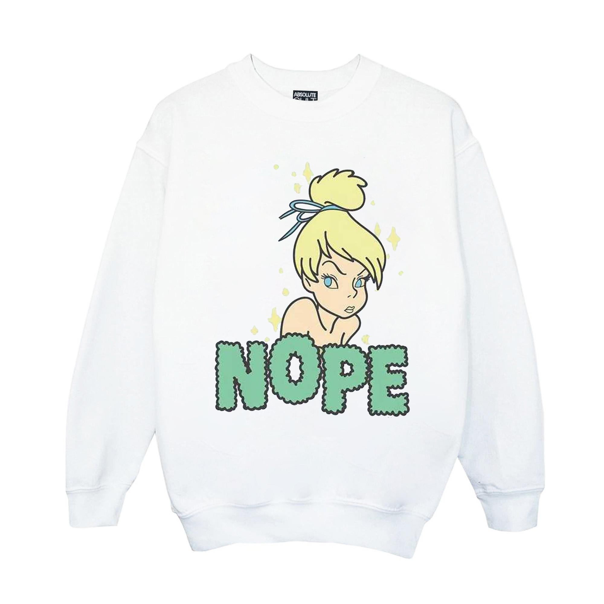 Questa felpa presenta una stampa grafica giocosa di Campanellino con la parola "Nope" in un carattere testurizzato. Il design aggiunge un tocco di fascino stravagante a un capo classico del guardaroba.