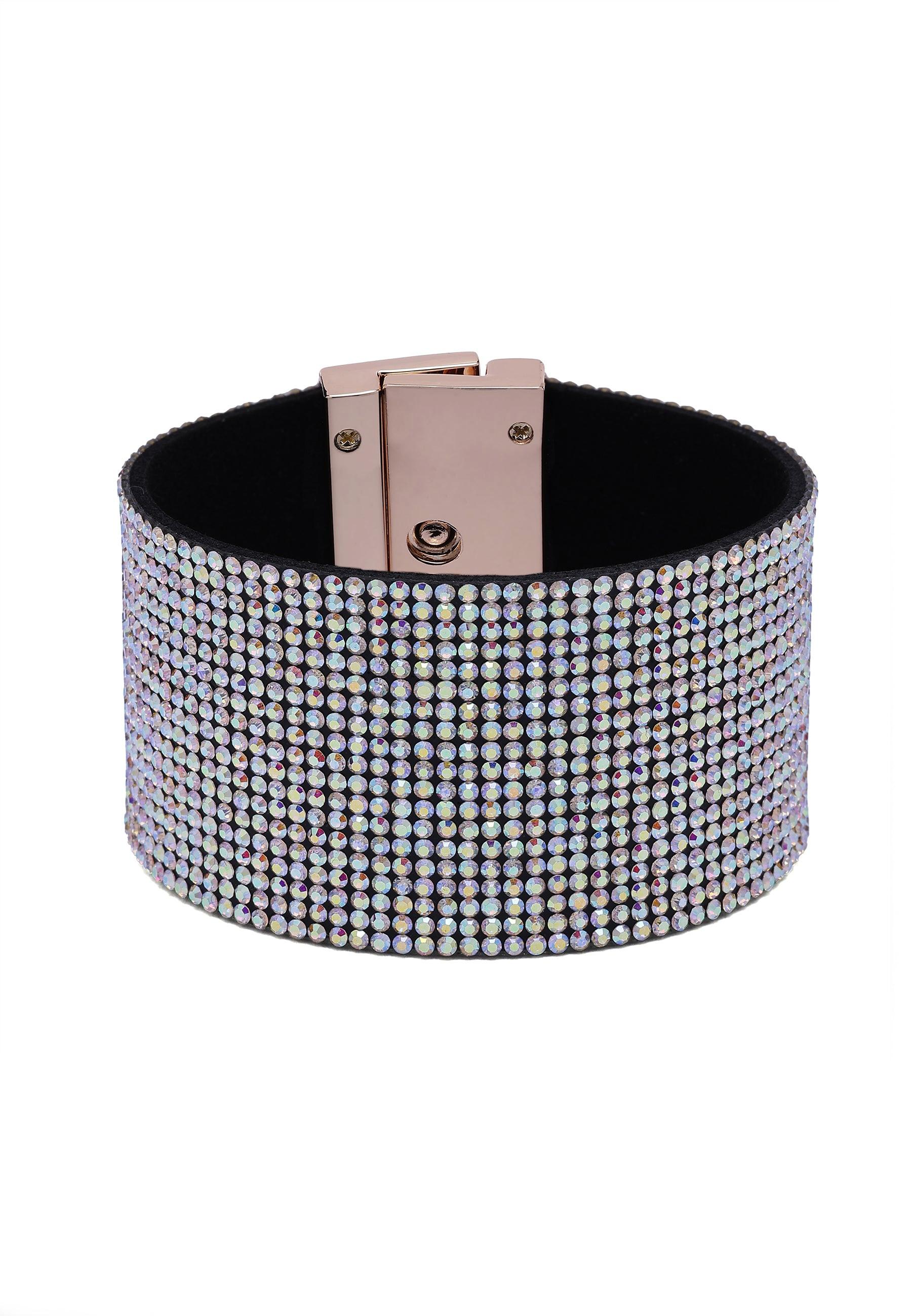 Avvolgi il tuo polso con pura energia da diva. Questo ampio bracciale in pelle è tempestato di cristalli multicolori, creando una lucentezza cristallina che ricorda quella di un red carpet. Foderato in morbida pelle scamosciata e rifinito con un'elegante chiusura lucida, è un pezzo audace e lussuoso per le serate in cui vuoi che tutti gli occhi siano puntati su di te. Dimensioni: Diametro 6,5 cm, Lunghezza 20 cm, Larghezza 4 cm | Placcatura: Placcato oro | Chiusura: Fibbia magnetica