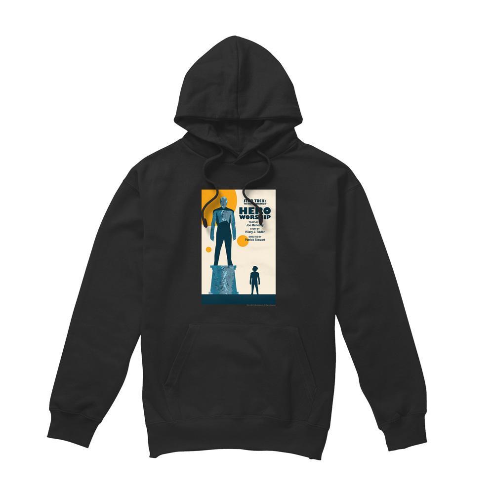 Questa felpa con cappuccio presenta una stampa grafica ispirata a "The Next Generation Stagione 5 Episodio 11: Hero Worship". Il design mostra una rappresentazione stilizzata di un personaggio in piedi su un piedistallo, con un personaggio più piccolo che guarda in alto, il tutto su uno sfondo vibrante.