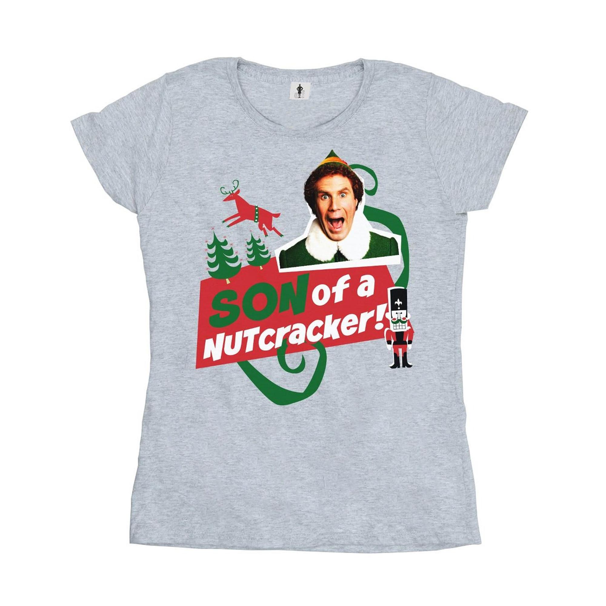 Questa T-shirt presenta una stampa grafica festiva ispirata al film "Elf", rendendola un'aggiunta divertente a qualsiasi guardaroba casual. Il design include Buddy l'elfo, una renna e uno schiaccianoci, insieme alla frase "Son of a Nutcracker!".