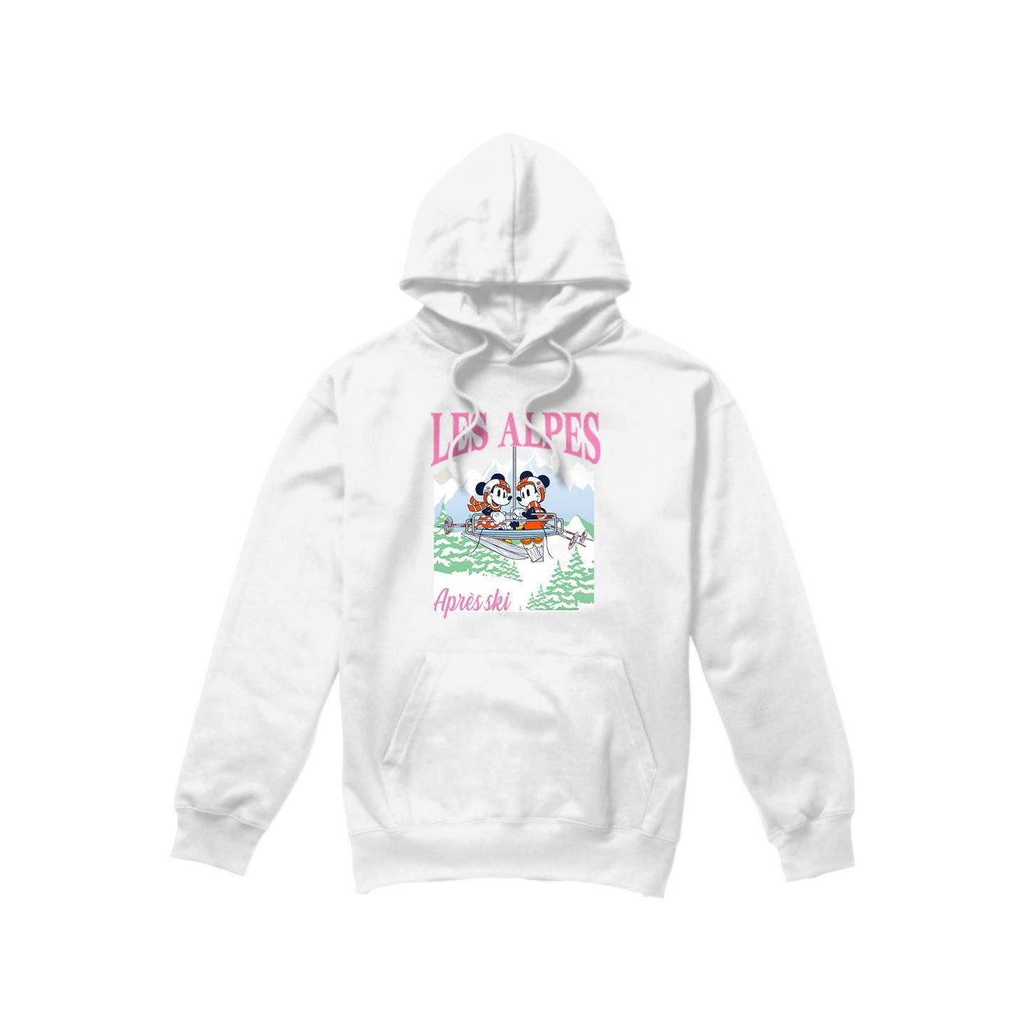Questa comoda felpa con cappuccio presenta una stampa grafica giocosa sul davanti, raffigurante una scena sciistica con personaggi dei cartoni animati e il testo «LES ALPES» e «Après ski». Il design aggiunge un tocco di divertimento e stile, rendendola un'ottima scelta per l'abbigliamento casual.