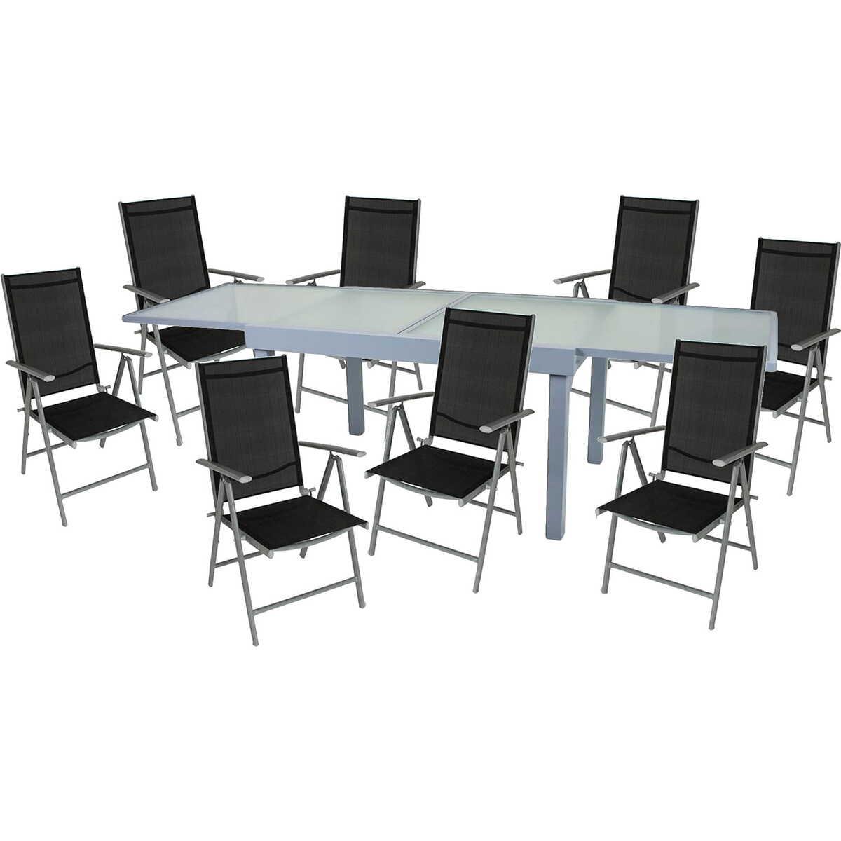 Realizzato in alluminio e acciaio di alta qualità verniciato a polvere. Tavolo da pranzo versatile con piano in vetro temperato facile da pulire. Funzione estensibile per offrire maggiore spazio e flessibilità quando si accolgono gli ospiti. Otto sedie con schienale alto e regolazione per un comfort ottimale. Design accattivante nei toni dell'argento e del nero, che unisce eleganza e durata. La portata massima del tavolo è di 75 kg per un utilizzo sicuro e senza preoccupazioni.