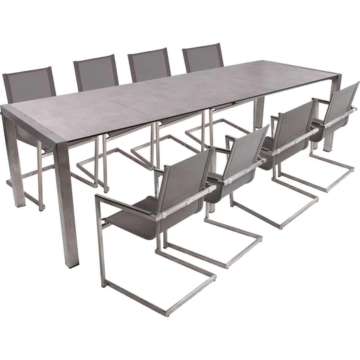 Design elegante e moderno Tavolo allungabile per un uso flessibile Acciaio inossidabile spazzolato e plastica HPL di alta qualità Materiali robusti e resistenti Include otto sedie a sbalzo per riunioni più numerose Ideale per cene all'aperto Sedia: portata massima 110 kg Tavolo: portata massima 85 kg