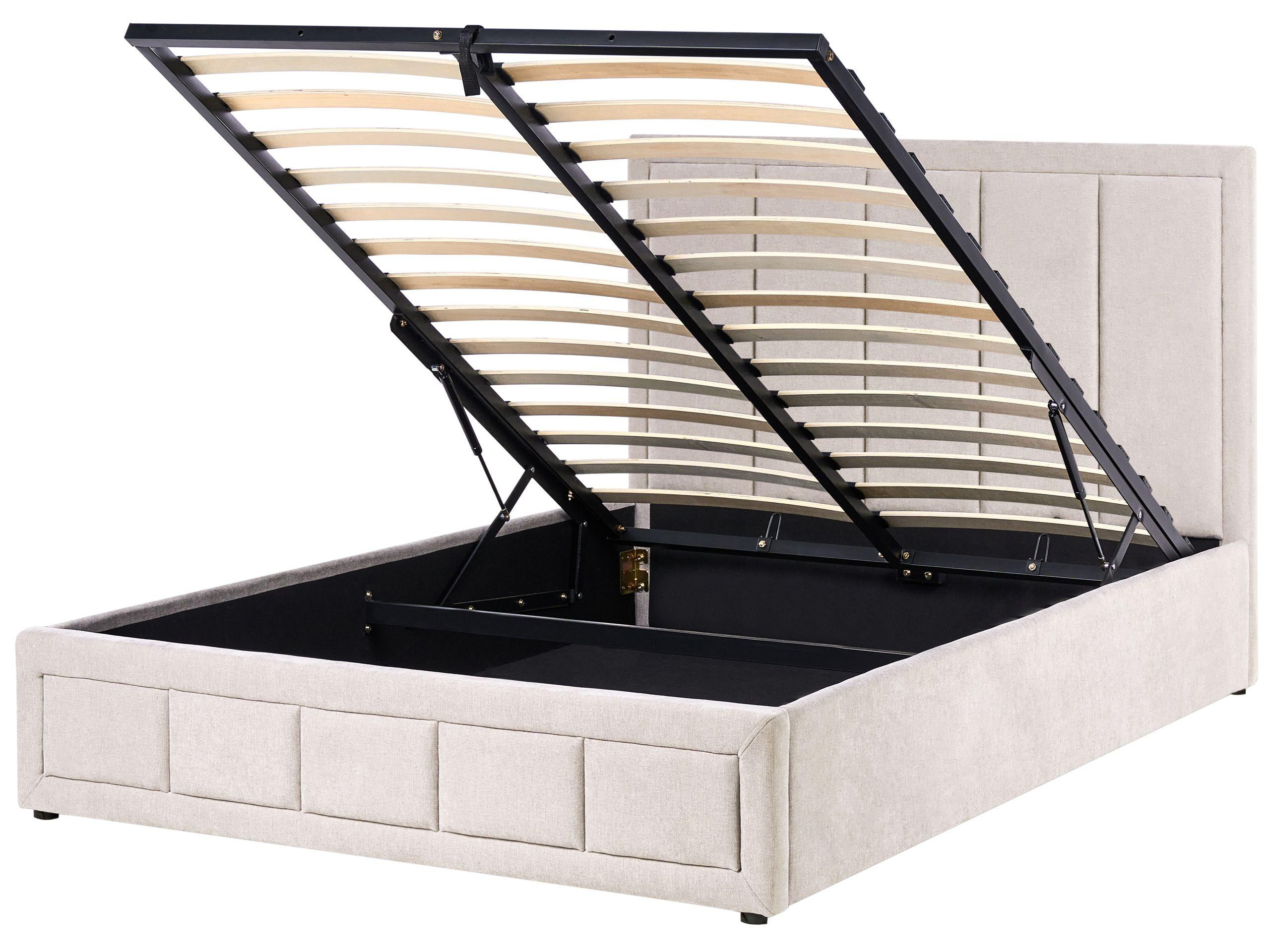 Letto contenitore con testiera. Questo letto contenitore dal design minimalista unisce stile e funzionalità, grazie al rivestimento in tessuto resistente e di facile manutenzione. La base a doghe sollevabile garantisce un adeguato supporto al corpo e offre uno spazio pratico per riporre la biancheria da letto, mentre la testiera trapuntata aggiunge un tocco di comfort. Il tono neutro lo rende una scelta versatile, adatta a qualsiasi stile di camera da letto.