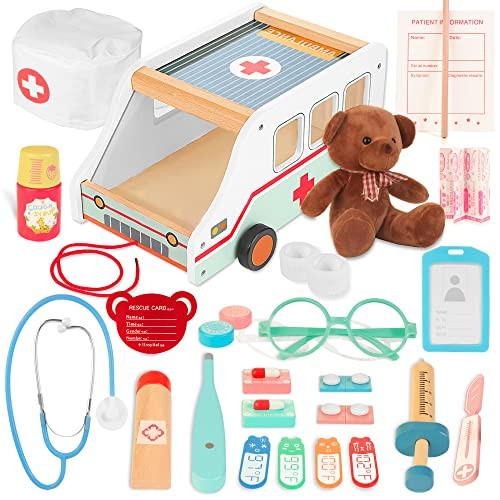 Activity-board, Hölzerne Ambulanz für Kinder, 37 Stück Arztkoffer mit Ambulanz Spielzeug & Plüschbär Rollenspiel