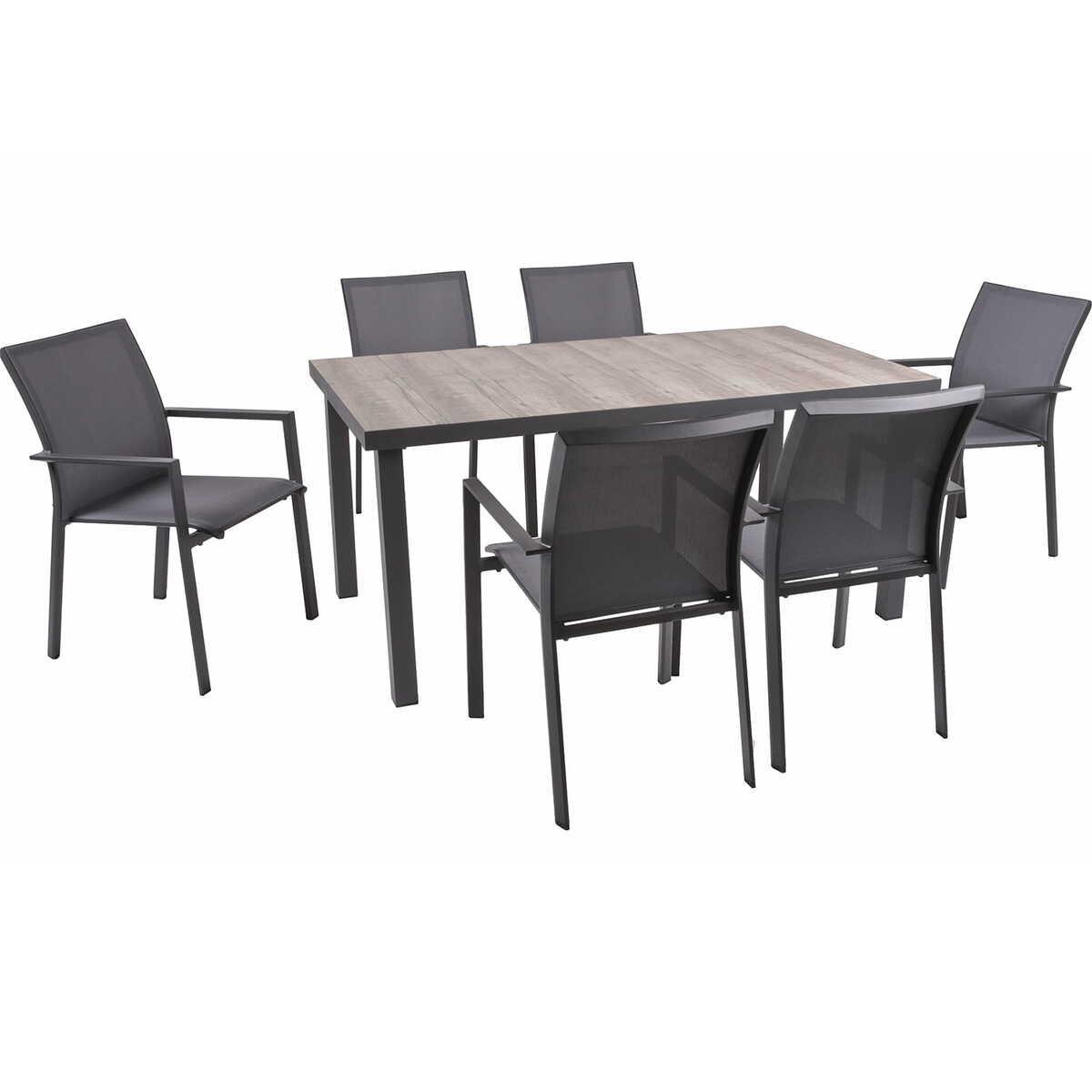 Design moderno e funzionale Robusta struttura in alluminio verniciato a polvere Piano del tavolo in ceramica effetto rovere Materiali resistenti agli agenti atmosferici e all'usura Sedie impilabili per un risparmio di spazio Portata massima: 120 kg (sedia), 50 kg (tavolo) Altezza dello schienale: 49 cm, con braccioli