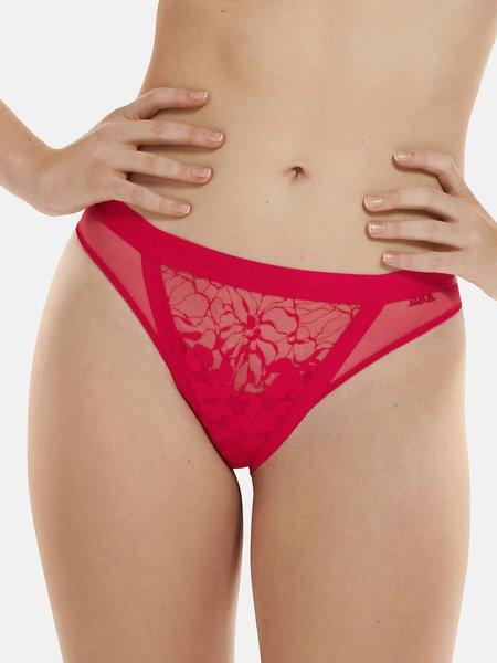 Questo slip della collezione Flamenco presenta un delicato pizzo sul davanti, discretamente foderato in tessuto e rifinito con un elastico liscio sul lato. La combinazione con la rete sottile sui fianchi prosegue sul retro sotto un'ampia fascia elastica in vita.