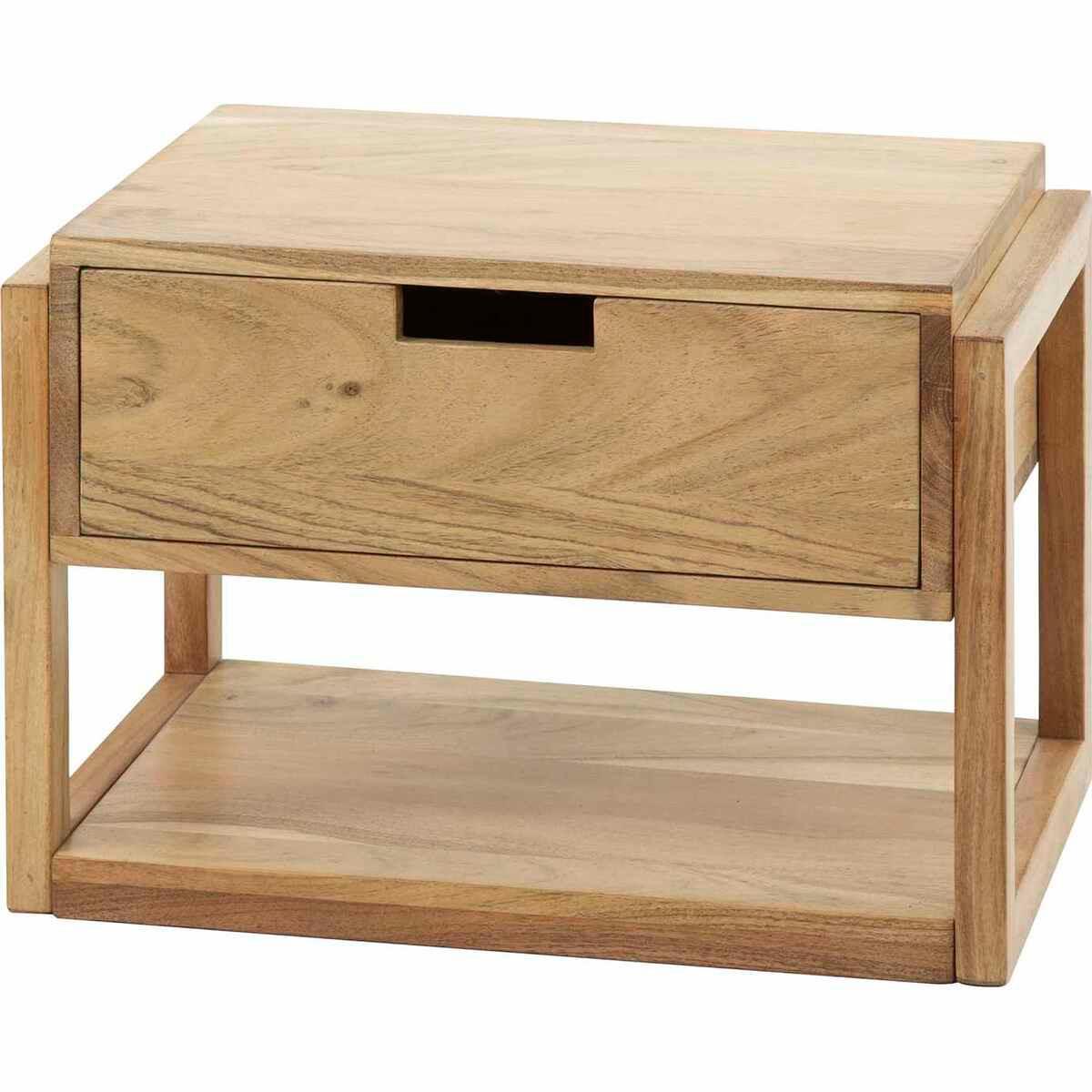 Questo comodino è realizzato in legno di acacia. Il comodino è fissato alla parete tramite una modanatura. Il comodino è dotato di un cassetto e di un vano aperto. Il comodino è adatto a qualsiasi camera da letto e, essendo appeso, crea una sensazione di maggiore spazio.