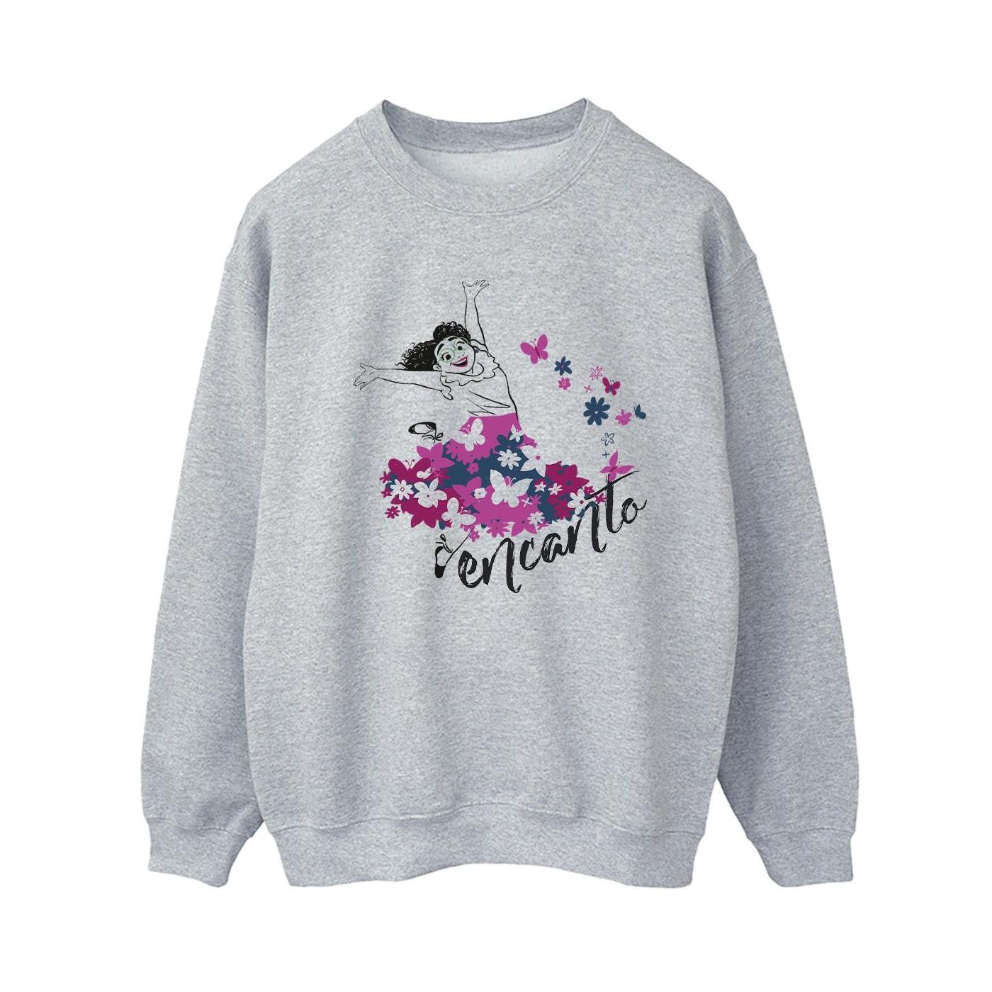 Questa felpa presenta una vivace stampa grafica ispirata a Encanto di Disney, rendendola un'aggiunta deliziosa a qualsiasi guardaroba casual. Il design mostra un personaggio circondato da fiori e farfalle colorate, con il logo 'Encanto' elegantemente scritto sotto.