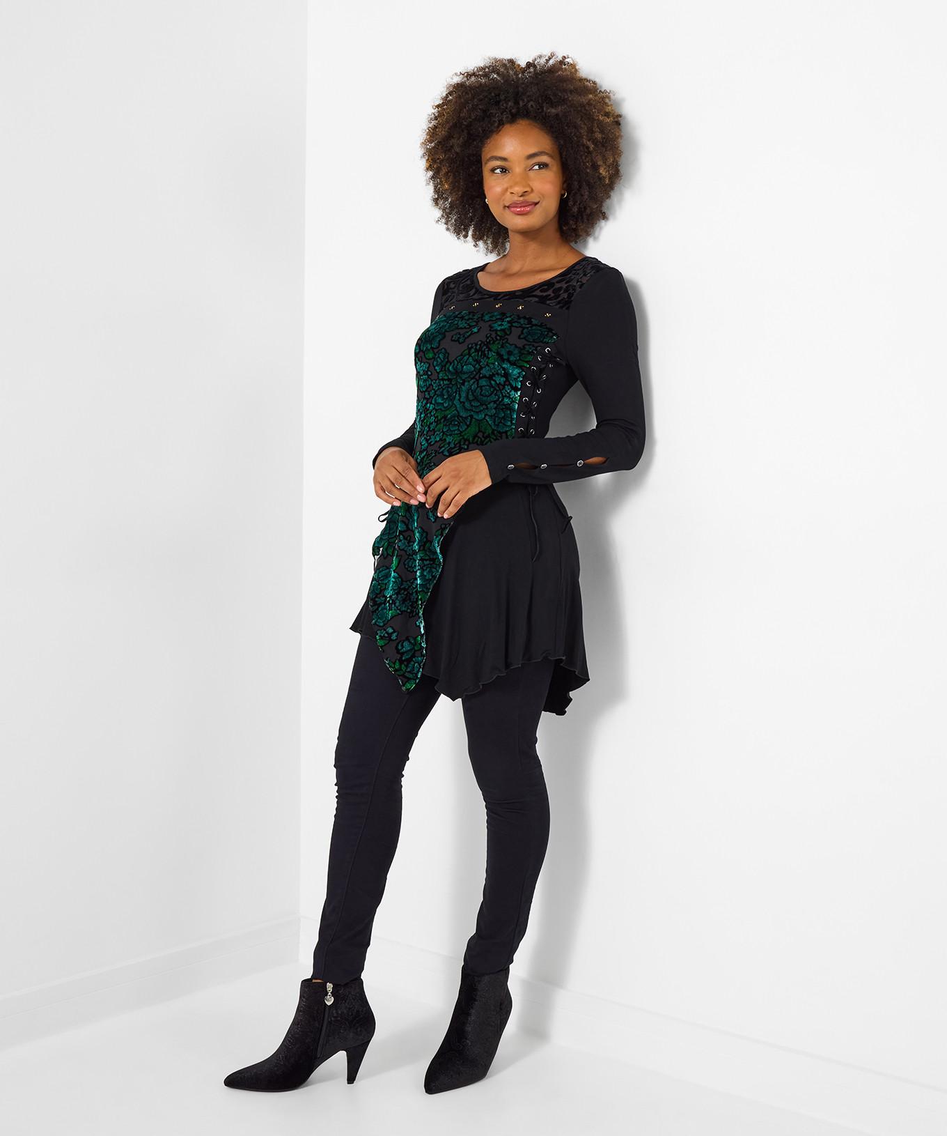 Questa tunica in jersey devoré incarna un'eleganza senza sforzo, garantendo un aspetto radioso. Presenta un design unico con un motivo paisley sul davanti, creando un look distintivo ed elegante. Le maniche lunghe e lo scollo rotondo offrono una vestibilità comoda e rilassata, mentre l'orlo asimmetrico aggiunge un tocco moderno.