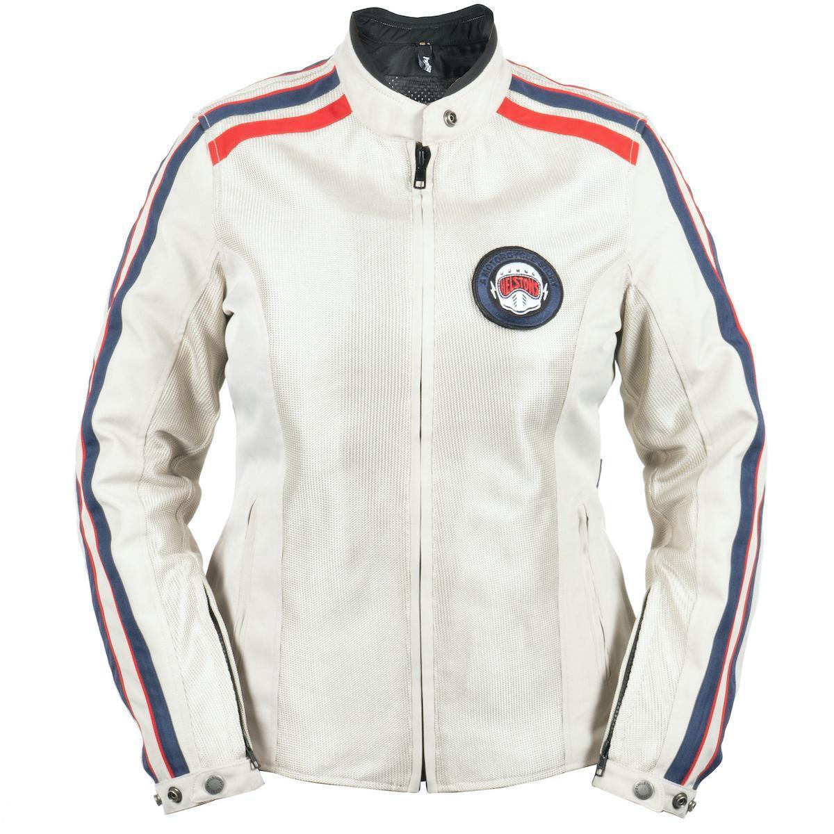 Questa giacca da moto è realizzata in tessuto a rete, offrendo traspirabilità e comfort. Il design include distintive strisce rosse e blu sulle maniche e sulle spalle, aggiungendo un'estetica da corsa classica. Una toppa rotonda con grafica è ben visibile sul petto.