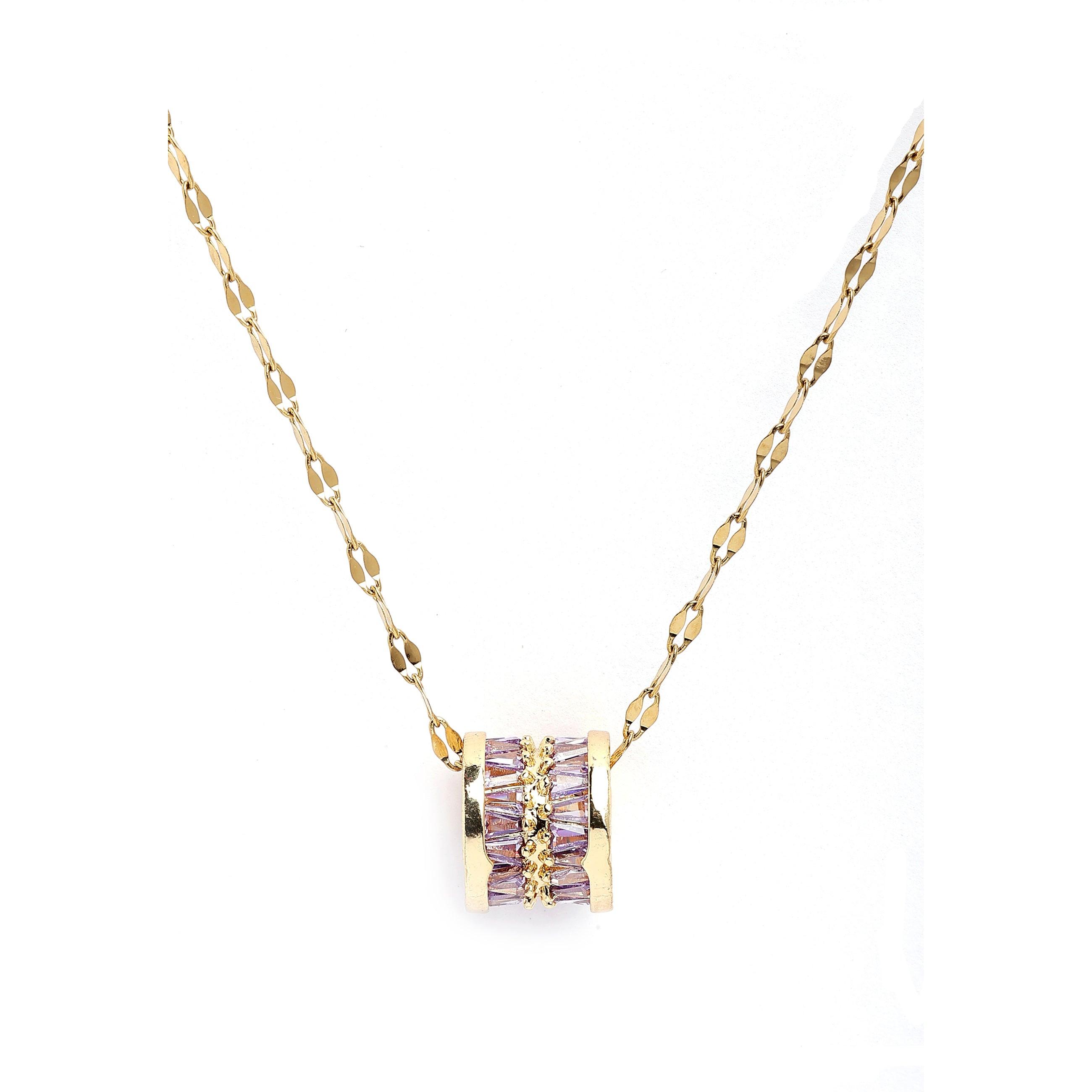 L'elegante collana a catena cilindrica intarsiata Diva della collezione Diva, caratterizzata da una catena color oro con un cilindro di zirconi cubici viola, è un pezzo accattivante. Il punto focale della collana è un piccolo pendente cilindrico, intarsiato con pietre di zirconi cubici viola. Questa collana è adatta a diverse occasioni, dalle uscite informali agli eventi formali, aggiungendo un fascino discreto ma sofisticato a qualsiasi outfit. Indossala da sola per un look minimalista e raffinato. Questa collana sarà sicuramente un pezzo eccezionale, che unisce eleganza a un tocco di colore e design moderno. Dimensioni: 1 cm x 1,2 cm | Placcatura: Placcato oro | Chiusura: Moschettone