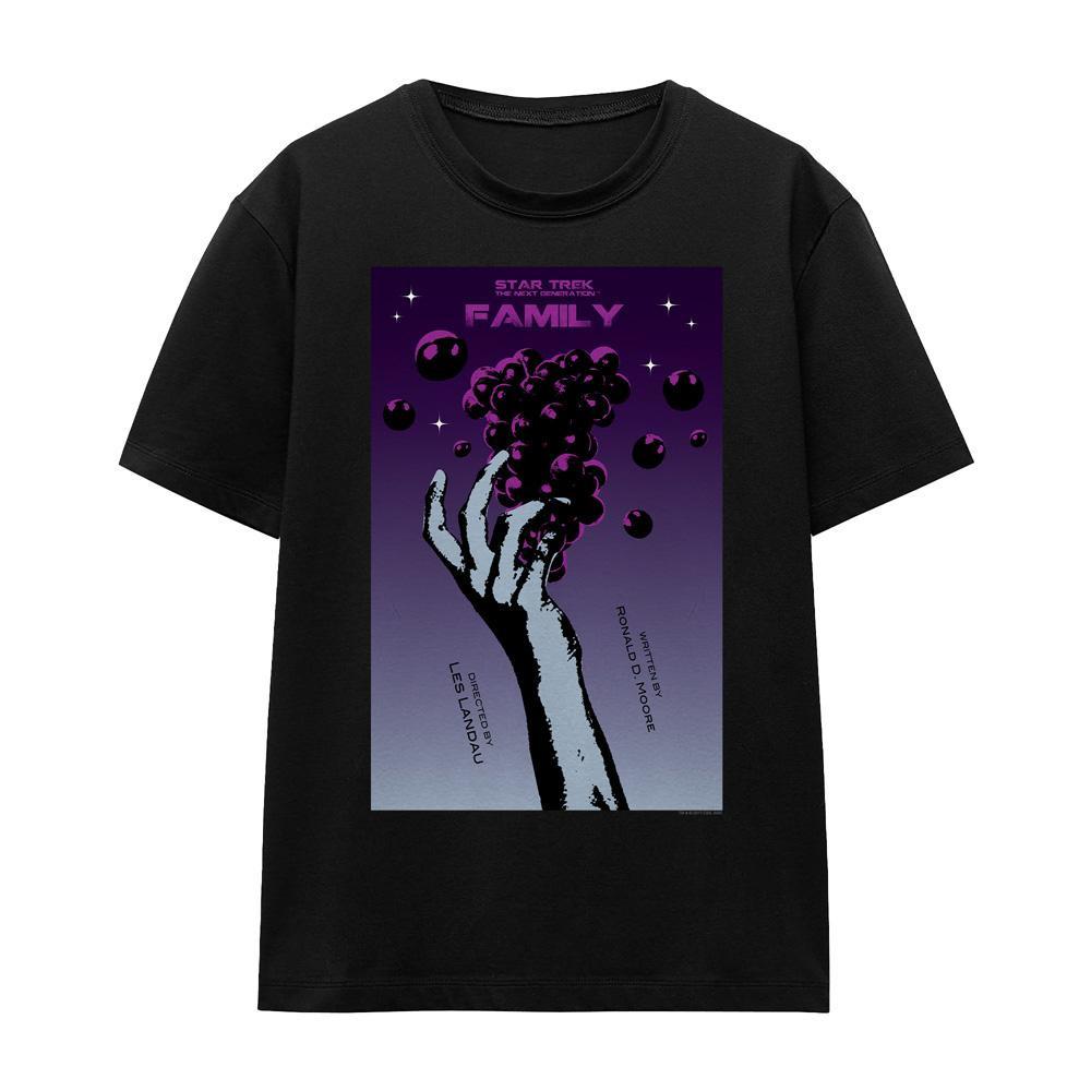 Questa T-shirt presenta una stampa grafica unica ispirata a "Star Trek: The Next Generation" Stagione 4, Episodio 2. Il design mostra una mano che tiene un gruppo di oggetti sferici scuri su uno sfondo viola, con stelle e il titolo della serie ben visibili. È un'aggiunta comoda ed elegante al guardaroba di ogni fan.