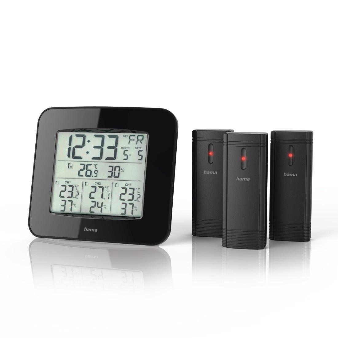 Stazione meteo Hama "EWS-Trio", con tre sensori, Nero. Set di quattro parti, composto da una stazione base e tre sensori wireless da esterno, per la visualizzazione di ora, giorno della settimana, data, temperatura, ecc, giorno della settimana, data, temperatura e umidità.. Pulsante per attivare comodamente la retroilluminazione e lo snooze della retroilluminazione e della funzione snooze.. Icona che informa in caso di bassa capacità della batteria della stazione e del sensore esterno<. capacità della batteria della stazione e del sensore esterno.. Possibilità di montare la stazione base a parete oppure di posizionare la stazione base con piedini pieghevoli.. Regolamenti sul retro dei sensori consentono un facile montaggio.. L'indicatore luminoso di trasmissione sul sensoreTermometro:. Visualizzazione della temperatura interna ed esterna.. cambiabile tra gradi Celsius e Fahrenheit. Memoria dei valori massimi e minimiIgrometro:. Visualizzazione dell'umidità interna ed esterna umidità esterna. Memoria degli alti e dei bassiFunzione orologio/calendario/sveglia:. Formato dell'ora commutabile 12-/24-h. Visualizza data e giorno della settimana in inglese. Funzione di allarme e snooze