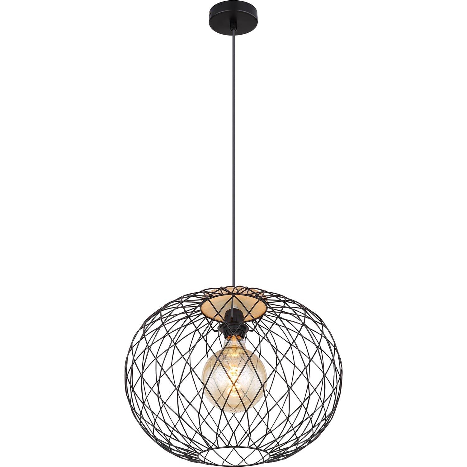 Lampada a sospensione: metallo nero opaco, legno marrone, metallo nero opaco, cavo tessile nero, : 400mm, H: 1500mm, esclusa 1x E27 60W 230V.