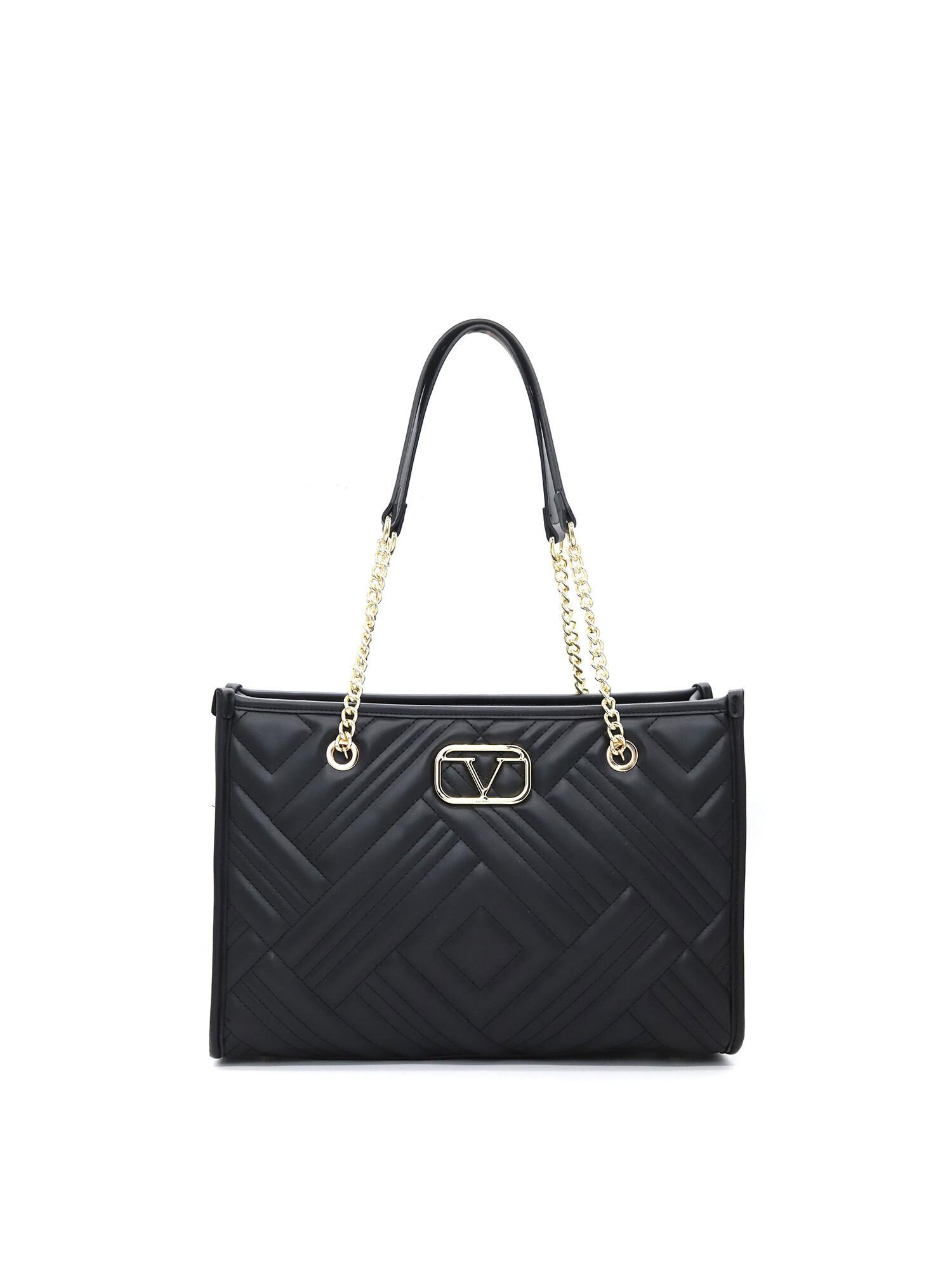 Borsa shopper da donna con cerniera. una con tasche interne con cerniera. tasche esterne mancanti. in catena e tracolla in similpelle. manico mancante. uno scomparto interno. Materiale esterno. Interno foderato in poliestere. Dimensioni: 35x24x11 cm. Prodotto di moda