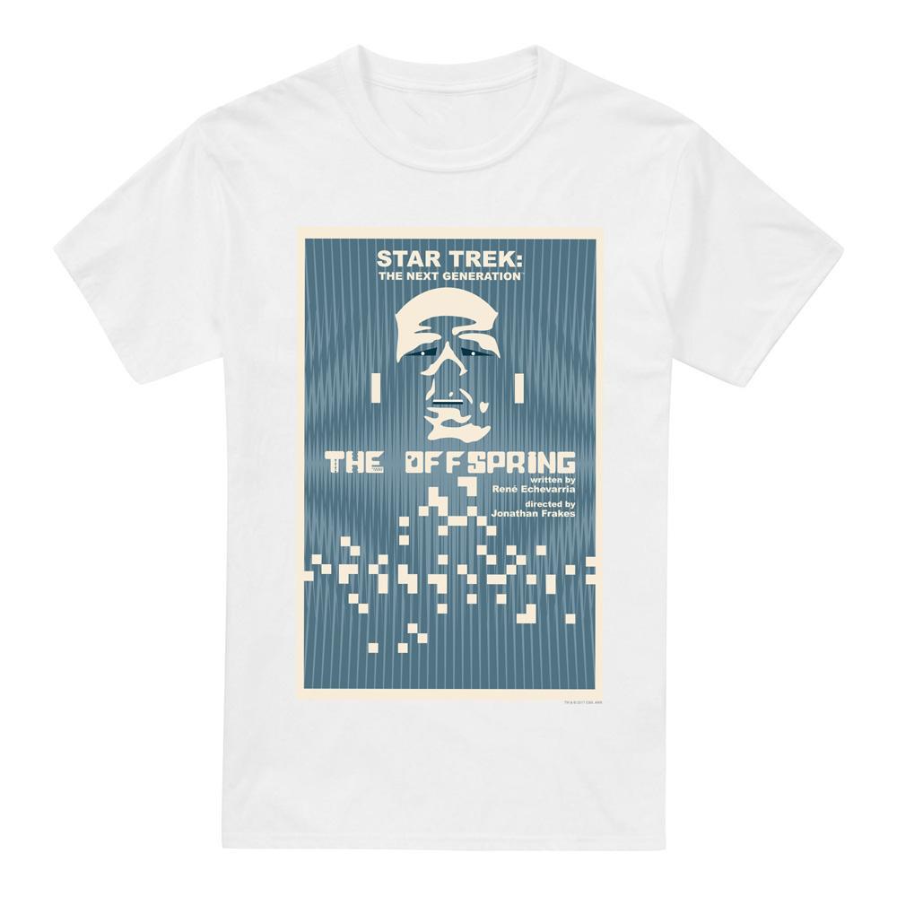 Questa T-shirt presenta una stampa grafica ispirata a "Star Trek: The Next Generation" Stagione 3, Episodio 16, intitolato "The Offspring". Il design mostra una rappresentazione stilizzata del volto di Data con un effetto pixelato, su uno sfondo blu con linee verticali. Il titolo dell'episodio e i crediti per lo scrittore e il regista sono anch'essi incorporati nella grafica.