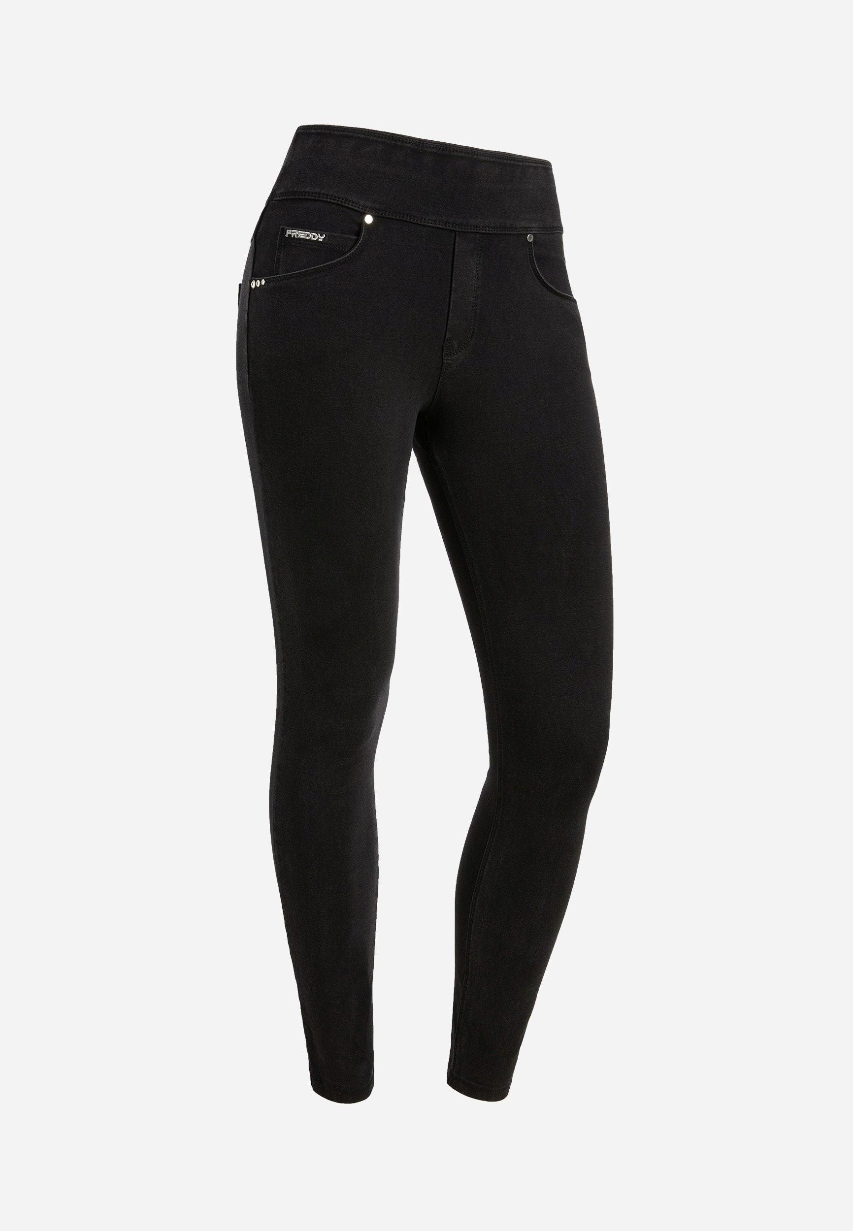 I pantaloni N.O.W.® di Freddy sono realizzati in jersey elastico effetto denim, un tessuto morbido composto da cotone biologico ed elastan riciclato. Con il loro classico taglio jeans a 5 tasche, impreziosito da rivetti con paillettes, il modello presenta una vita media senza bottone, una lunghezza standard e una vestibilità skinny che aderisce comodamente alle linee del corpo. I dettagli di tendenza sono completati da un logo Freddy in metallo con paillettes cucite sulla tasca posteriore e una fascia in jacquard logata reversibile in vita.