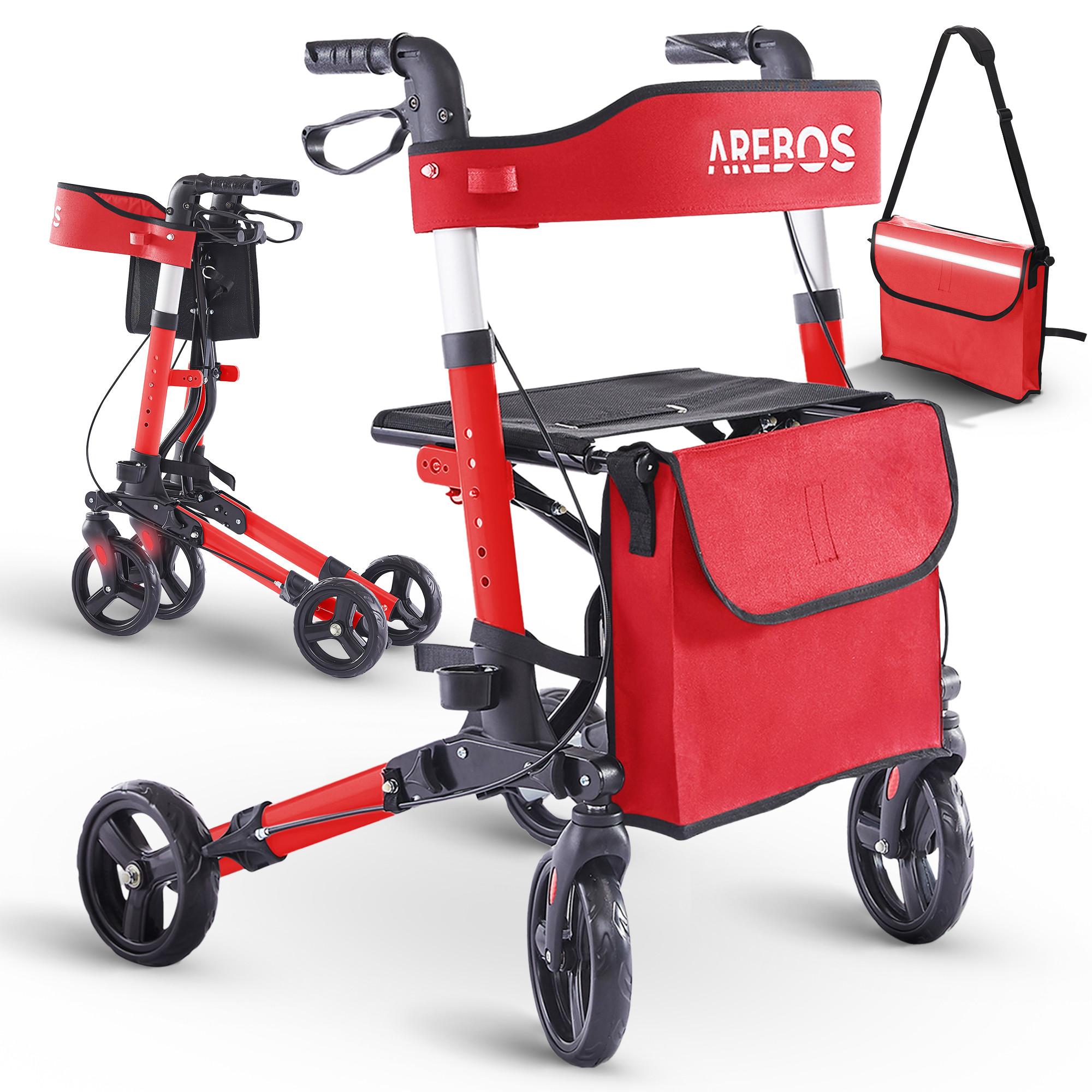 Il deambulatore leggero AREBOS offre numerosi vantaggi: il sedile incorporato offre la possibilità di sedersi in qualsiasi momento, consentendo pause a piacere durante i viaggi. Lo schienale favorisce una posizione di seduta rilassante, apportatrice di sollievo all’intero sistema osseo-muscolare. Le sei diverse impostazioni dell'altezza consentono di adattare il deambulatore a qualsiasi altezza corporea. Le impugnature ergonomiche offrono maggiore protezione ai polsi e ai palmi delle mani. I riflettori sulle ruote anteriori consentono la massima visibilità. Questo deambulatore può essere ripiegato in pochi secondi, per risparmiare spazio e tempo quando, ad esempio, lo si carica in un’auto.