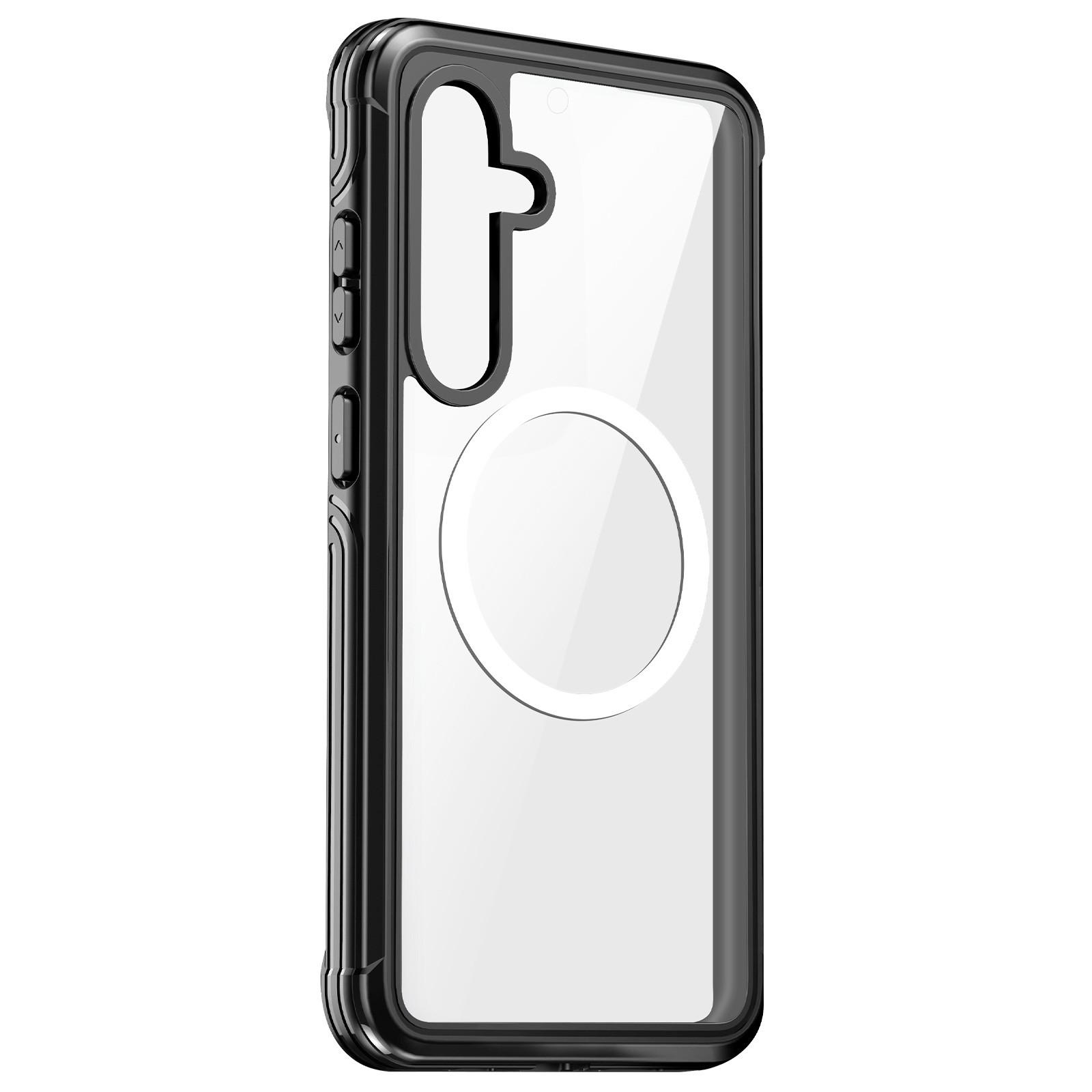 Cover a 360° per Samsung Galaxy S24. Combina un retro rigido con un bordo in silicone e angoli rinforzati. Bordi schermo e fotocamera rialzati. Film per lo schermo in plastica. Compatibile con la ricarica wireless. Funzioni accessibili. Tasti ridisegnati.