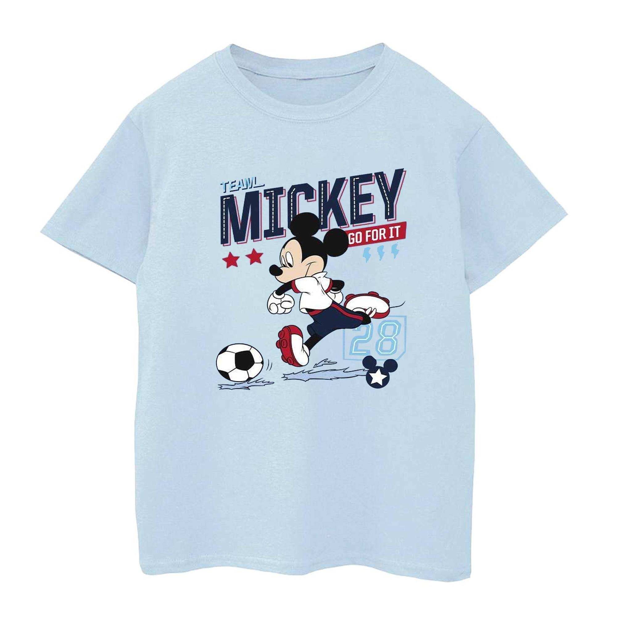 Questa T-shirt presenta una grafica giocosa di Topolino che gioca a calcio, rendendola un'aggiunta divertente a qualsiasi guardaroba casual. Il design include la scritta "TEAM MICKEY" e stelle, aggiungendo al suo fascino sportivo.