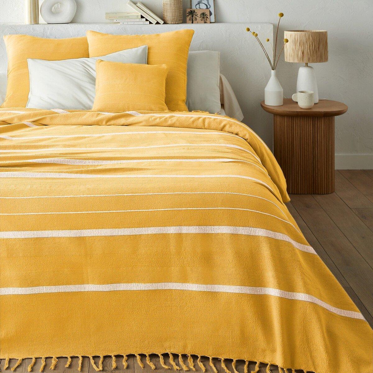 Il copriletto Nedo aggiunge un tocco di calore e stile a qualsiasi camera da letto. Il suo motivo a righe crea un'atmosfera invitante, mentre le delicate frange offrono un dettaglio affascinante.