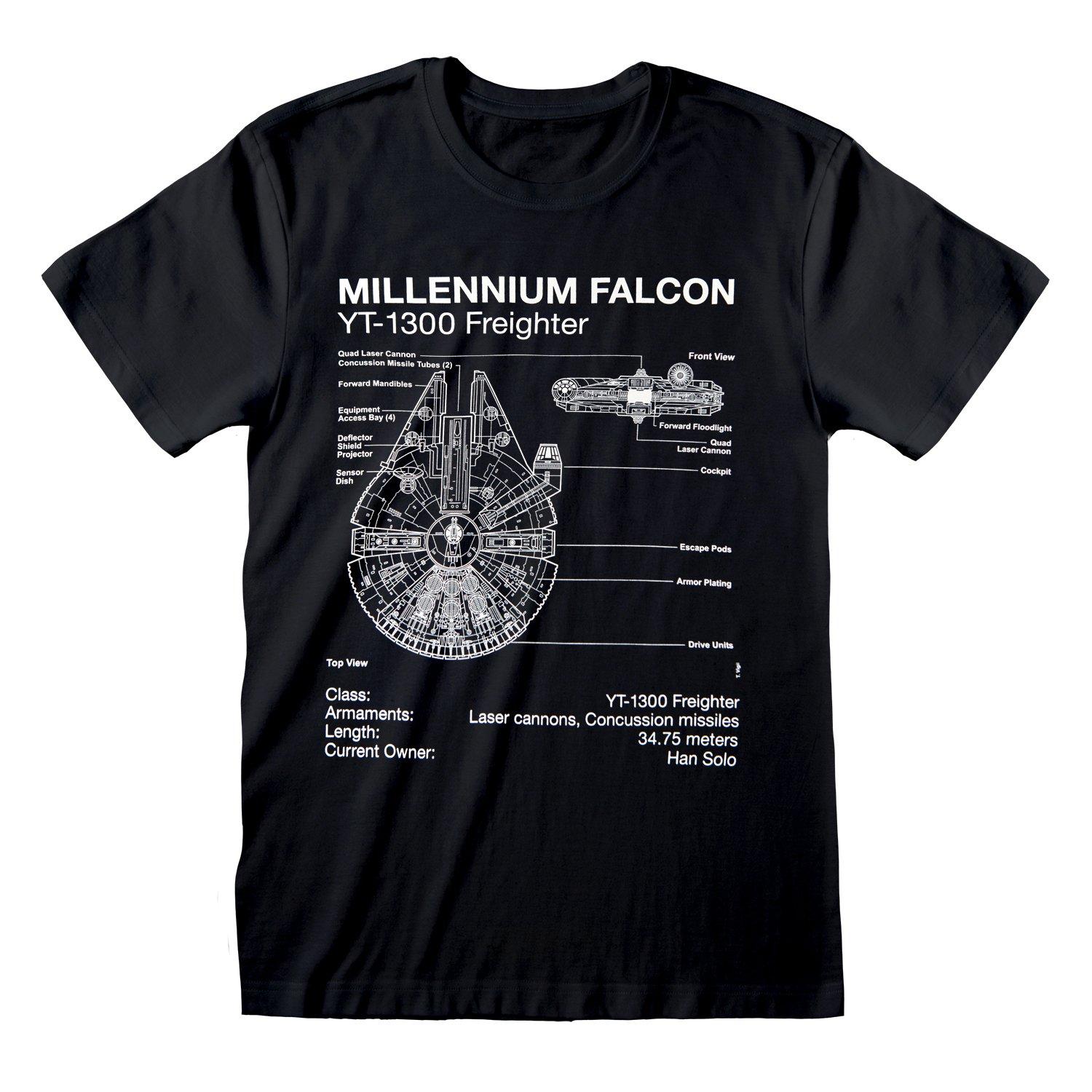 Questa T-shirt presenta una dettagliata planimetria dell'iconico cargo Millennium Falcon YT-1300, completa di specifiche e componenti chiave. È un must-have per i fan della leggendaria astronave.