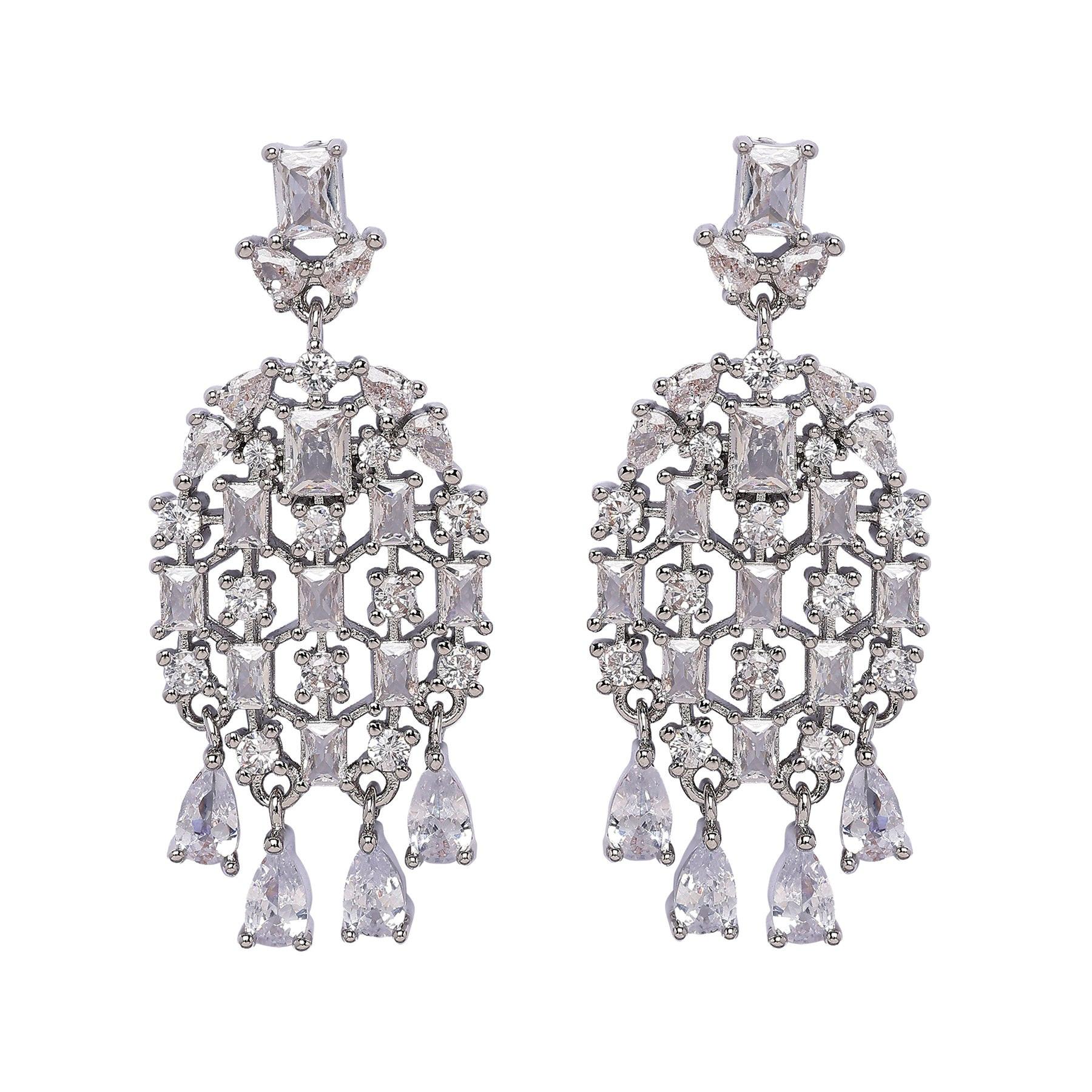 Caratterizzati da una squisita disposizione di gemme luminose, formano una silhouette sorprendente e aggraziata. Le pietre catturano la luce magnificamente, aggiungendo un tocco scintillante di lusso a qualsiasi look. Con il loro design raffinato, questi orecchini sono l'accessorio perfetto per impreziosire qualsiasi outfit con raffinatezza e fascino. Dimensioni: 1,6 cm x 3,8 cm | Placcatura: Placcata rodio | Chiusura: Perno e retro