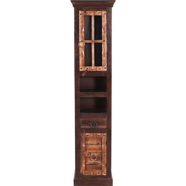 Questo mobile alto in legno di recupero scuro con decorazioni intagliate è un vero colpo d'occhio. Lo spazio di stivaggio dietro il vetro superiore e l'anta opaca inferiore, un cassetto e due scomparti a giorno offrono spazio sufficiente per tutti i tipi di cosmetici, ma anche per oggetti decorativi o souvenir delle vacanze. Il mobile alto adorna ogni bagno e, grazie al suo aspetto coloniale, ti dà quella sensazione di vacanza al mattino presto.