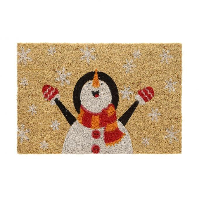 Ravviva il tuo ingresso con uno zerbino con motivo a pupazzo di neve, realizzato in fibra di cocco naturale, che offre un caldo benvenuto invernale e cattura efficacemente lo sporco.