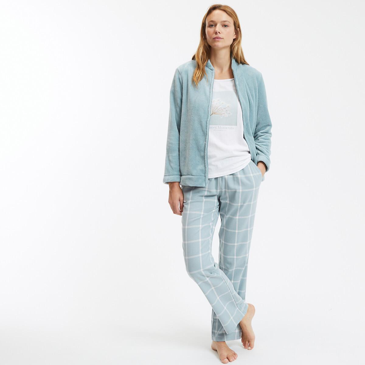 Questo pigiama a 3 pezzi offre comfort e stile per rilassarsi a casa. Include una giacca con cerniera e tasche laterali, una maglietta in jersey a maniche corte con stampa fotografica sul petto e pantaloni a quadri con elastico in vita.