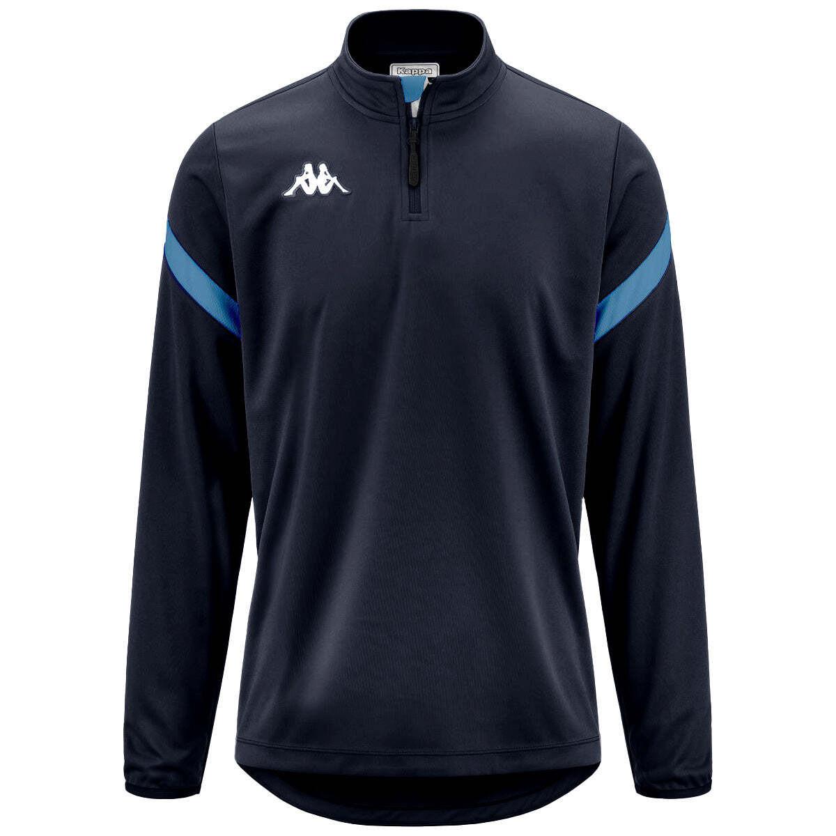 KAPPA4TEAM. Felpa da allenamento da uomo in tessuto interlock. TAGLIO ADERENTE. Apertura a mezza zip, inserto sulle maniche, polsini elasticizzati. Logo Omini ricamato sul davanti.