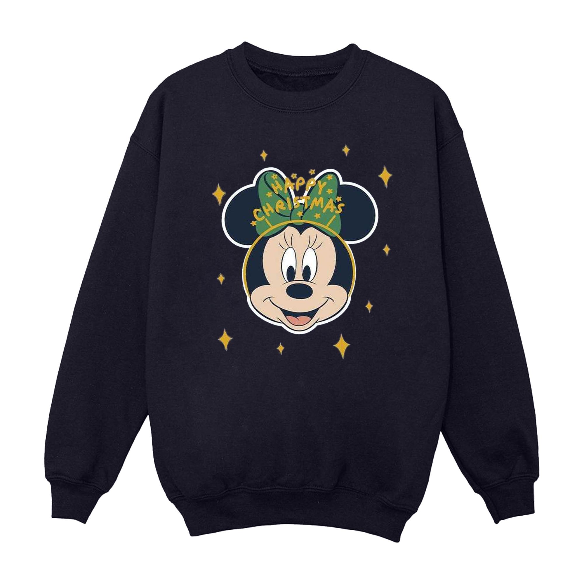 Questa felpa presenta un design festivo di Minnie Mouse, perfetto per celebrare le festività natalizie. La grafica mostra Minnie Mouse che indossa un fiocco verde con la scritta "Happy Christmas", circondata da stelle scintillanti.