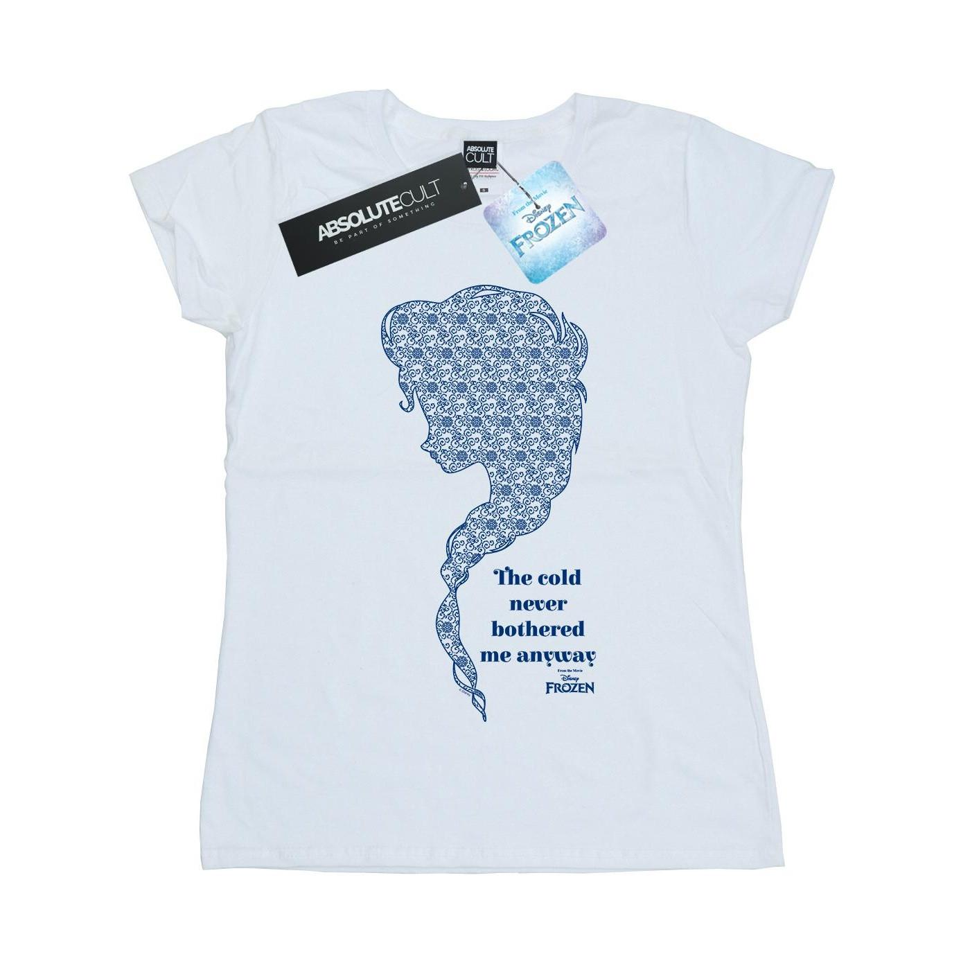 Questa T-shirt presenta un design unico ispirato all'amato personaggio Elsa di Disney Frozen. La silhouette della testa di Elsa e dei suoi capelli intrecciati è riempita con un intricato motivo blu, creando un look elegante e riconoscibile. Accanto alla silhouette, è stampata la frase iconica "The cold never bothered me anyway", che aggiunge un tocco di fascino e carattere al capo.