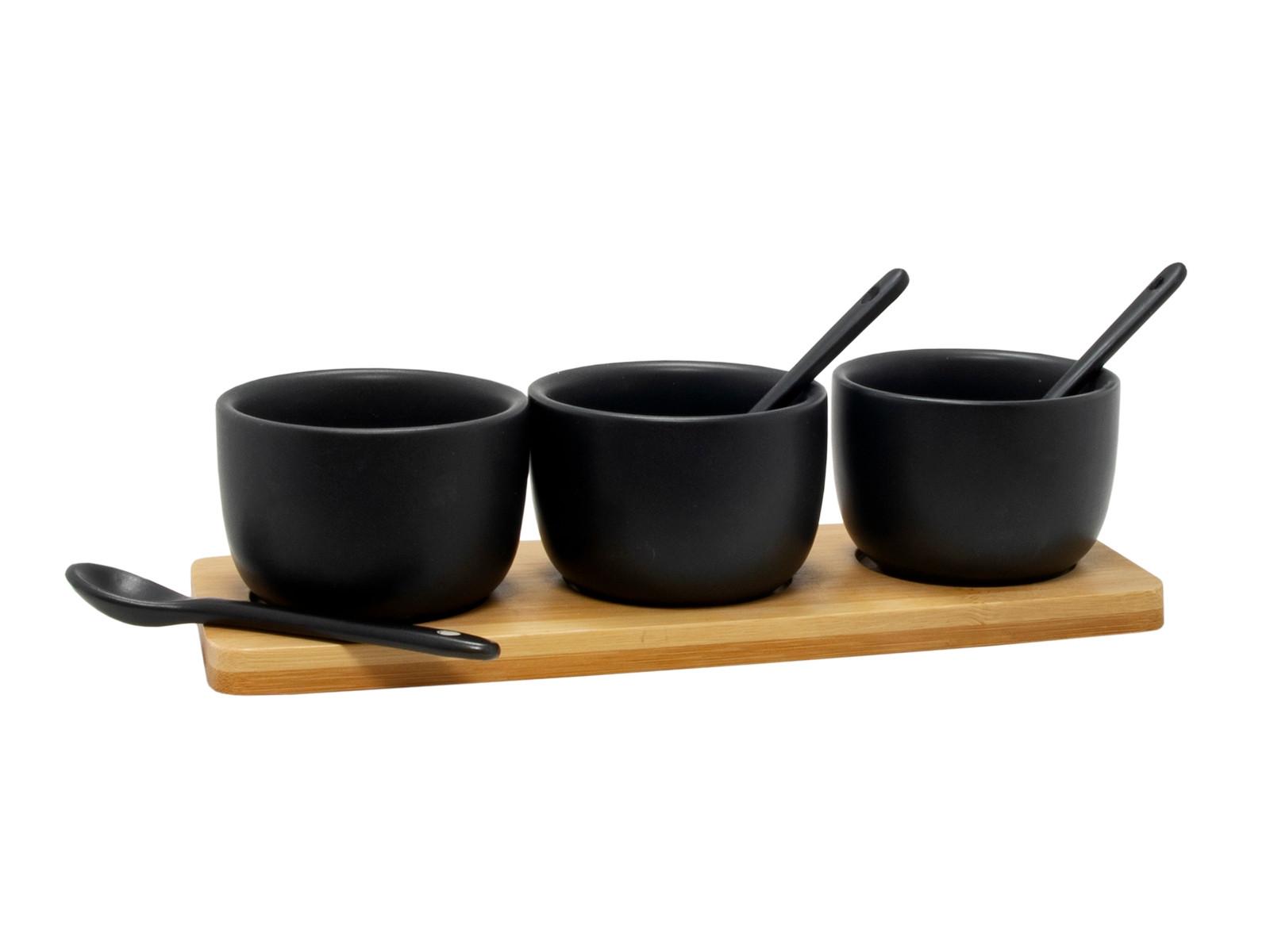 Questo set di tre ciotole su vassoio è perfetto per servire olive, noci, snack e salse. Le ciotole sono realizzate in porcellana di alta qualità, mentre il vassoio è realizzato in resistente bambù. Sono ottimi anche per presentare dolci mini-dessert.