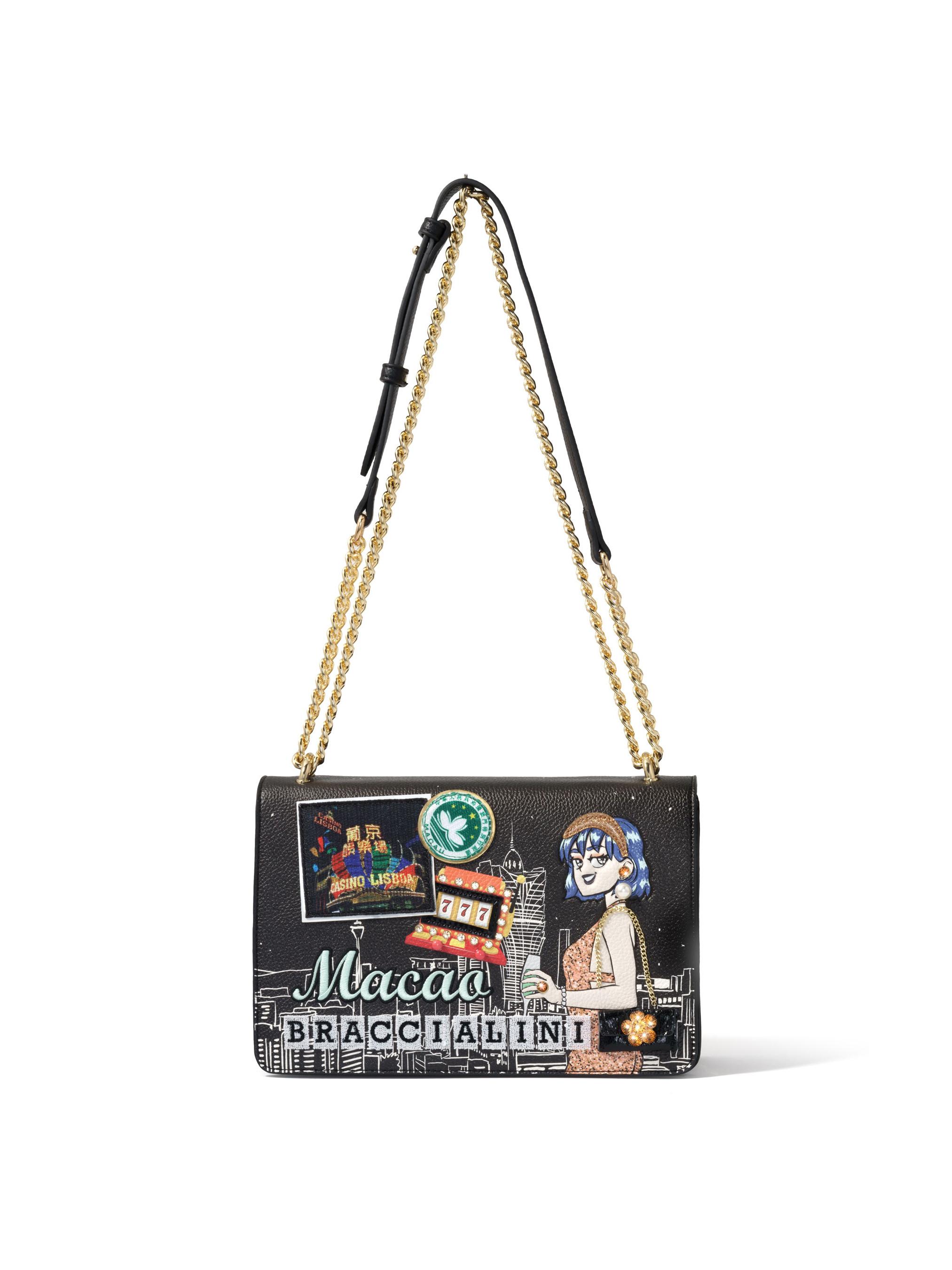 Questa borsa a tracolla presenta un design distintivo ispirato alla vibrante città di Macao. La parte anteriore della borsa mostra illustrazioni colorate, inclusi elementi di casinò e una donna elegante, insieme alla scritta "Macao BRACCIALINI". La parte posteriore della borsa presenta una sofisticata sagoma bianca dello skyline di Macao su uno sfondo scuro.